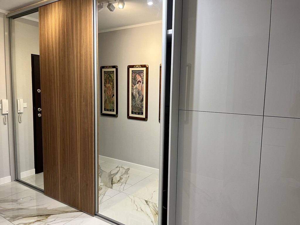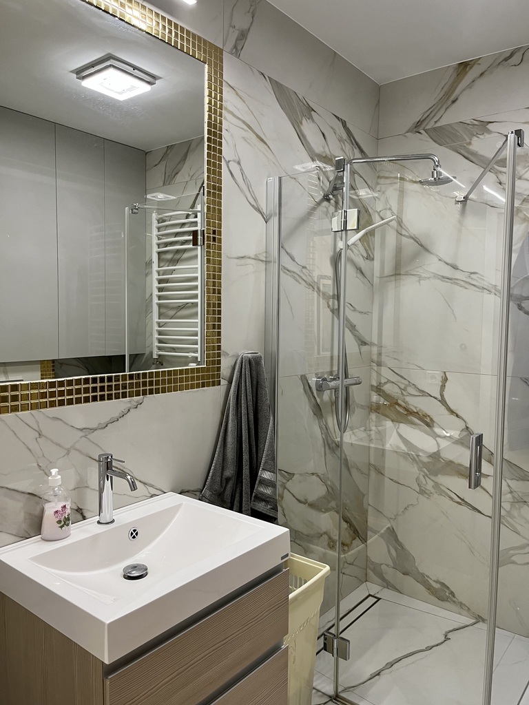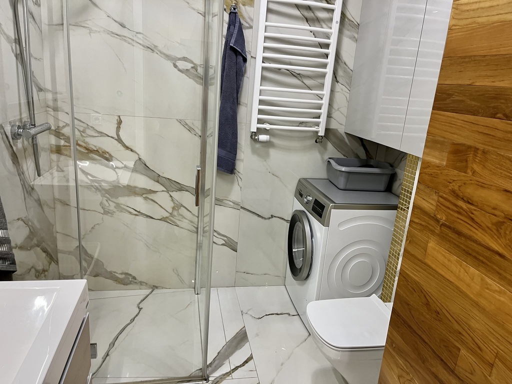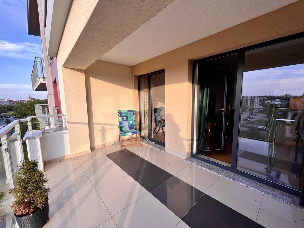 I am offering for sale a beautiful two-room apartment in a new building in a prestigious housing estate with interesting and unique architecture. The estate has beautiful and well-kept greenery, external and internal parking spaces, and playgrounds. Spacious housing estate, monitored, illuminated at night, a short distance from the city center (5 minutes by public transport). The apartment is located on the first floor of a building with an elevator with a north-west window. The apartment is practically new, without traces of use, finished with high-quality materials. There is natural wood on the floor (oak), the walls are covered with plaster and finished with a ceiling strip, in the bathroom and partly on the floor there are multi-format slabs and marble window sills. Hallway: permanently built-in wardrobes. Terrace 13 m2 finished with a view of the sunsets. Great location, close to the Kołobrzeg ring road and the city center. The apartment can be purchased with a parking space in the underground garage. The price of a parking space is PLN 50,000 (paid additionally). The apartment consists of a living room with a kitchen open to the living room, a bedroom and a bathroom. Everything arranged by an interior designer. The administrative rent is PLN 450/month. The apartment can be handed over immediately after the deed. The permanent buildings remain, including a kitchen with built-in appliances.