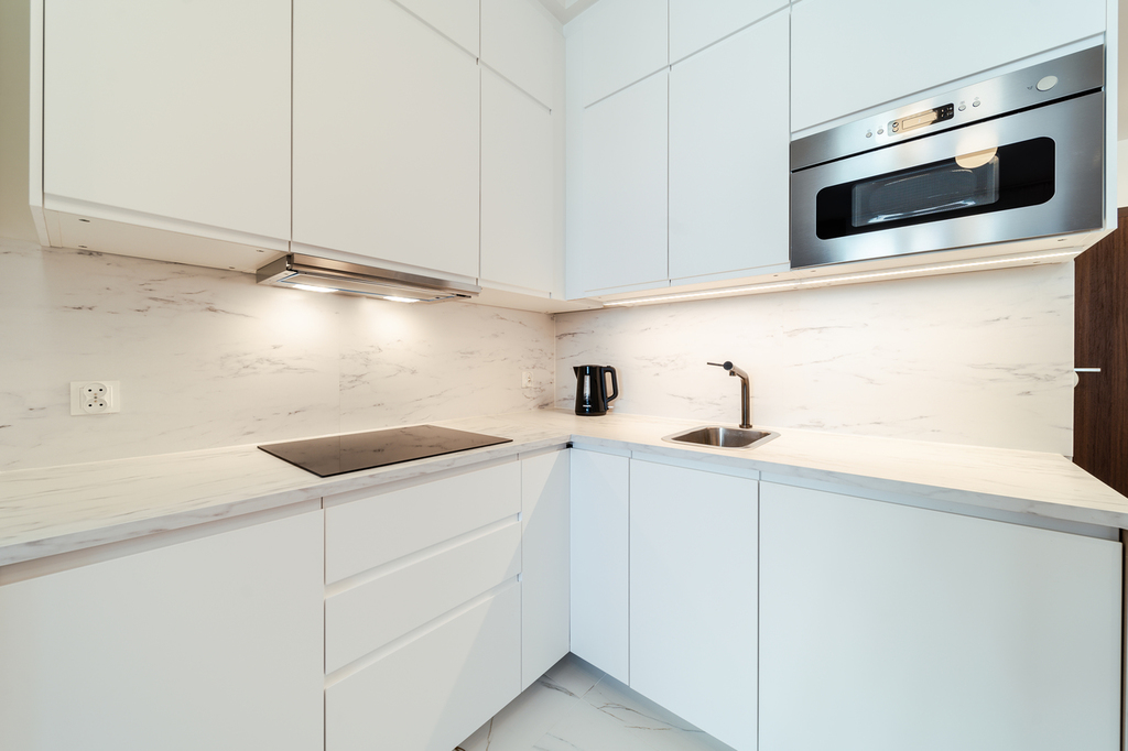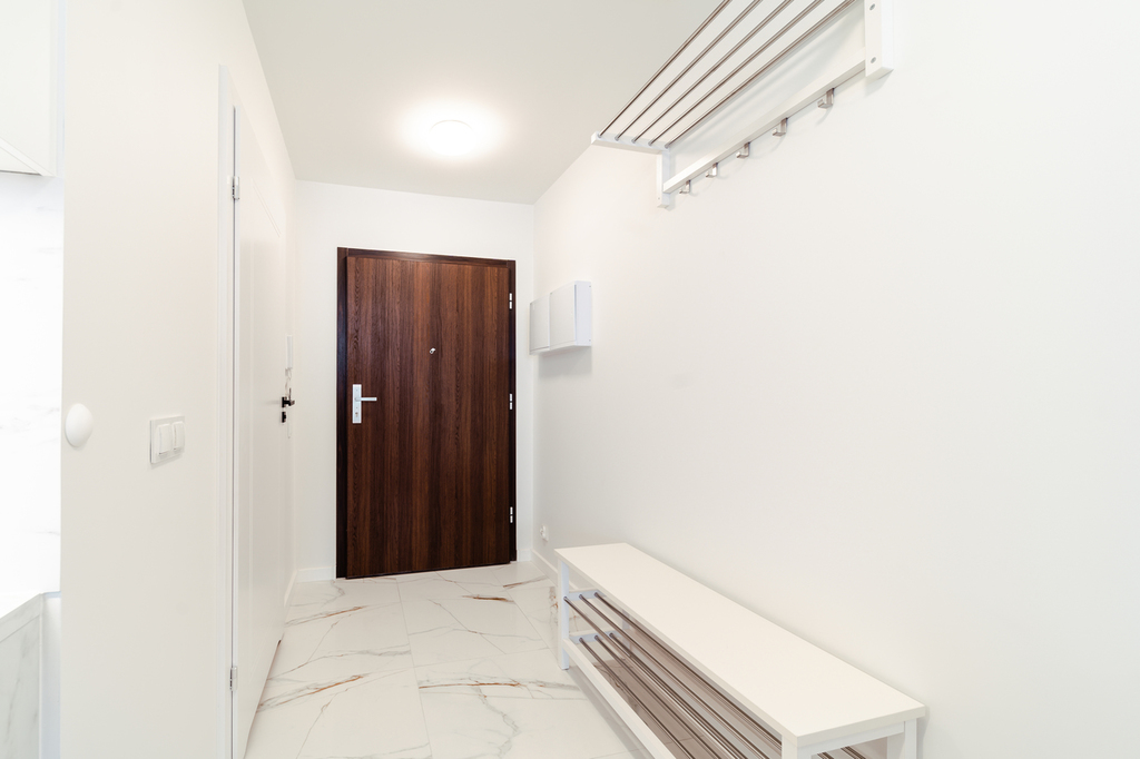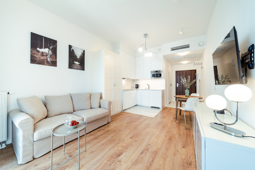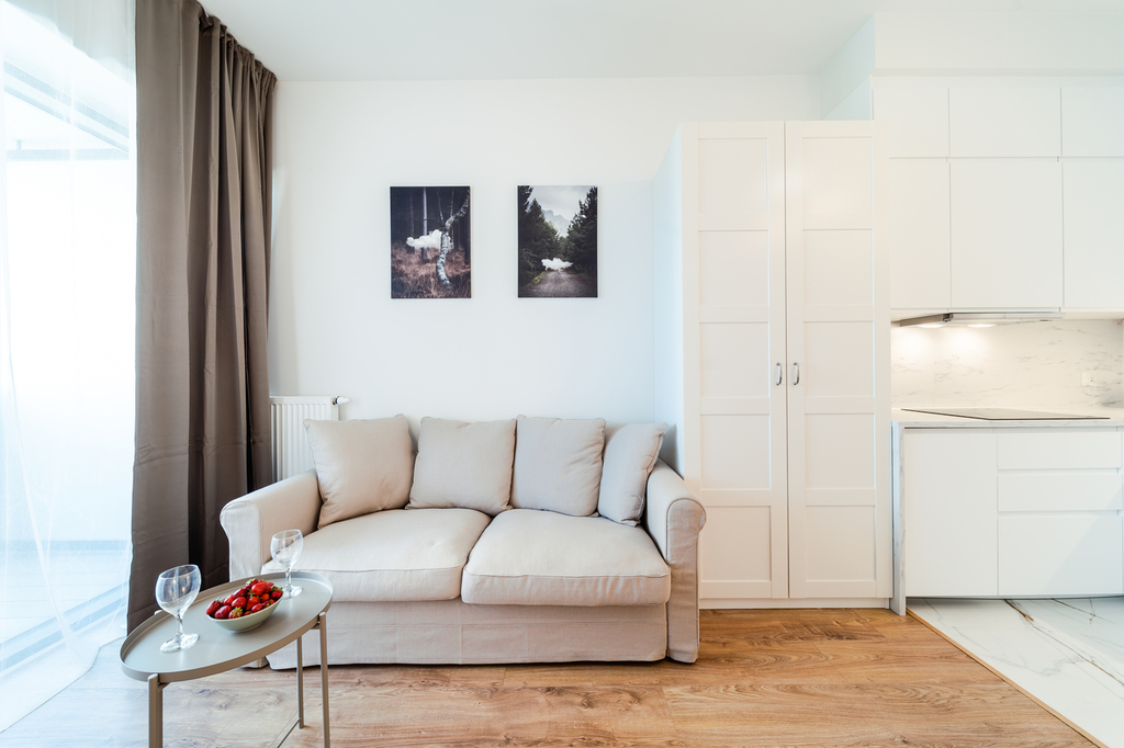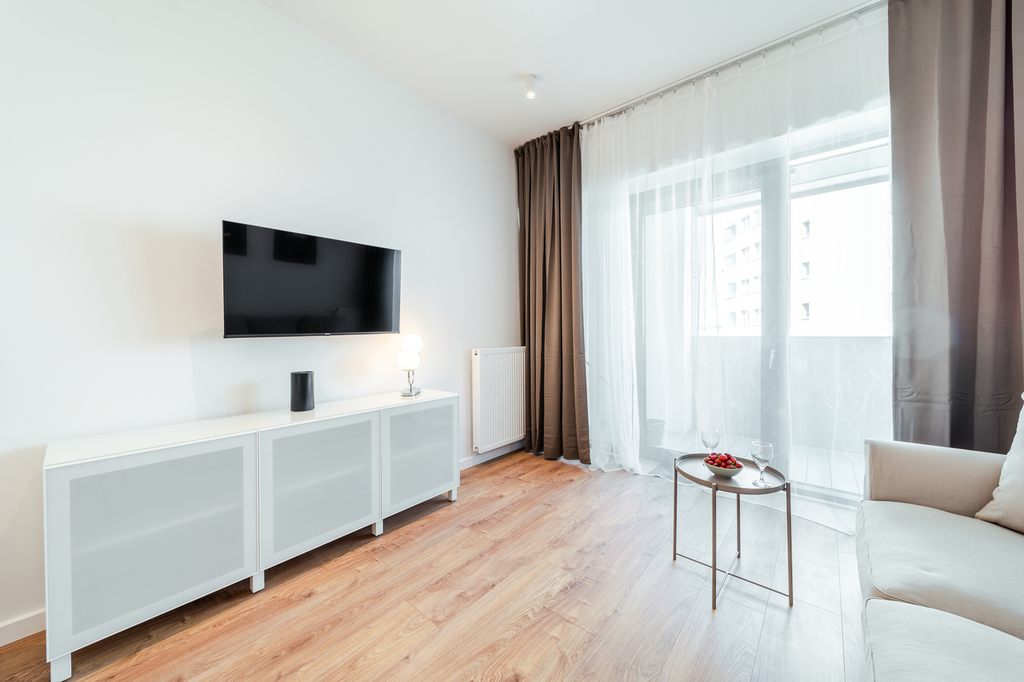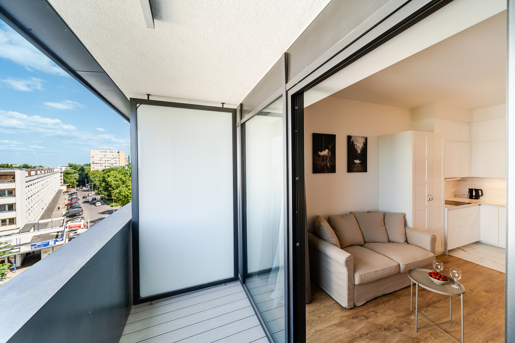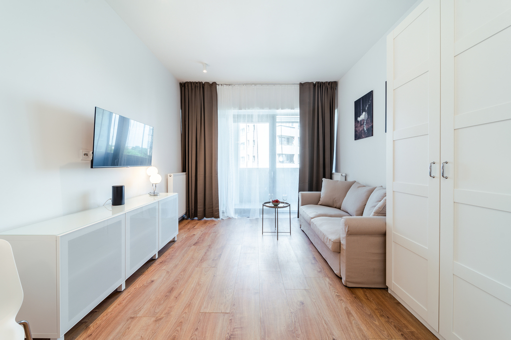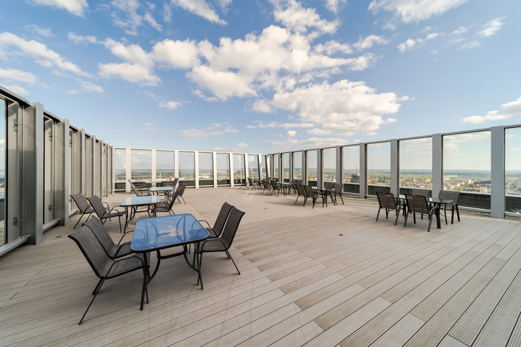 Apartment with an area of 25 m2 is located on the 4th floor of the building and consists of a living room with a kitchenette, a bathroom with a shower, a hall and a balcony. It is fully equipped with household appliances and electronics (washing machine, fridge with freezer, induction hob, microwave, cable TV, broadband Wi-Fi, hair dryer). Another undoubted advantage is air conditioning, which significantly increases comfort on hot days. Residents also have unlimited access to the spa area with an indoor swimming pool, jacuzzi, dry and wet sauna and a paddling pool for children (open from 7:00 a.m. to 10:00 p.m.). Additionally, residents have access to an observation deck on the 27th floor, from which you can admire the beautiful panorama of Szczecin while drinking coffee. There are also plans to include a gym and a playroom for children.