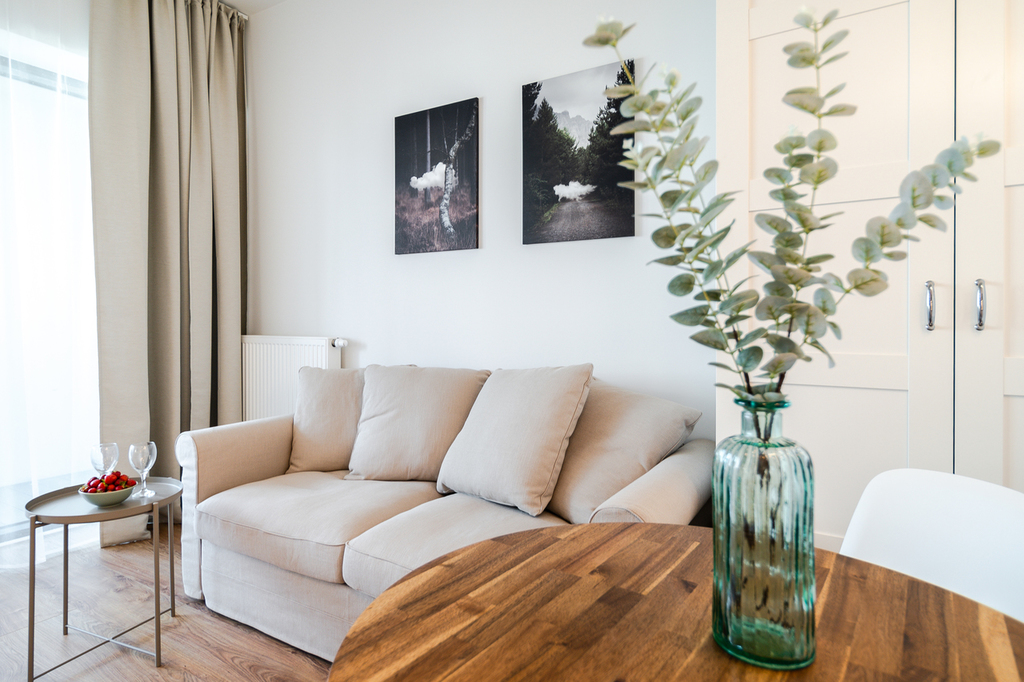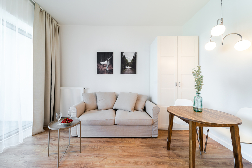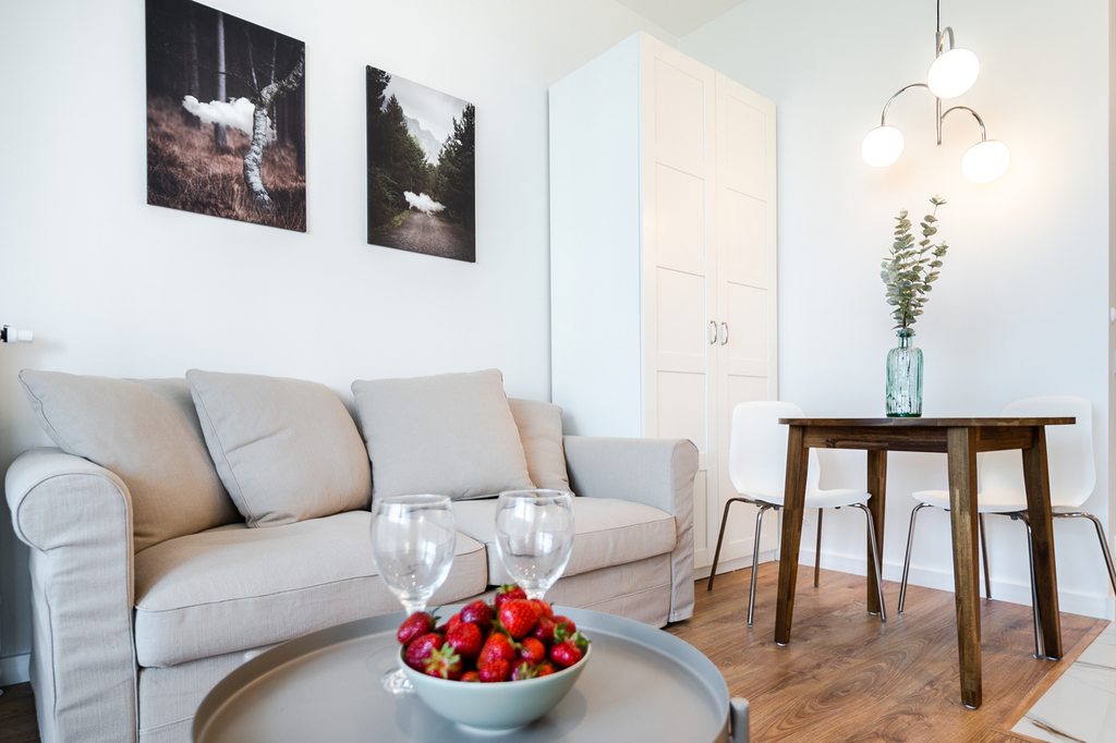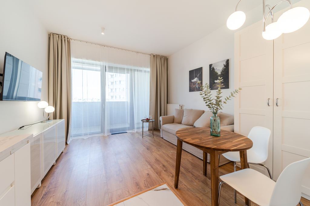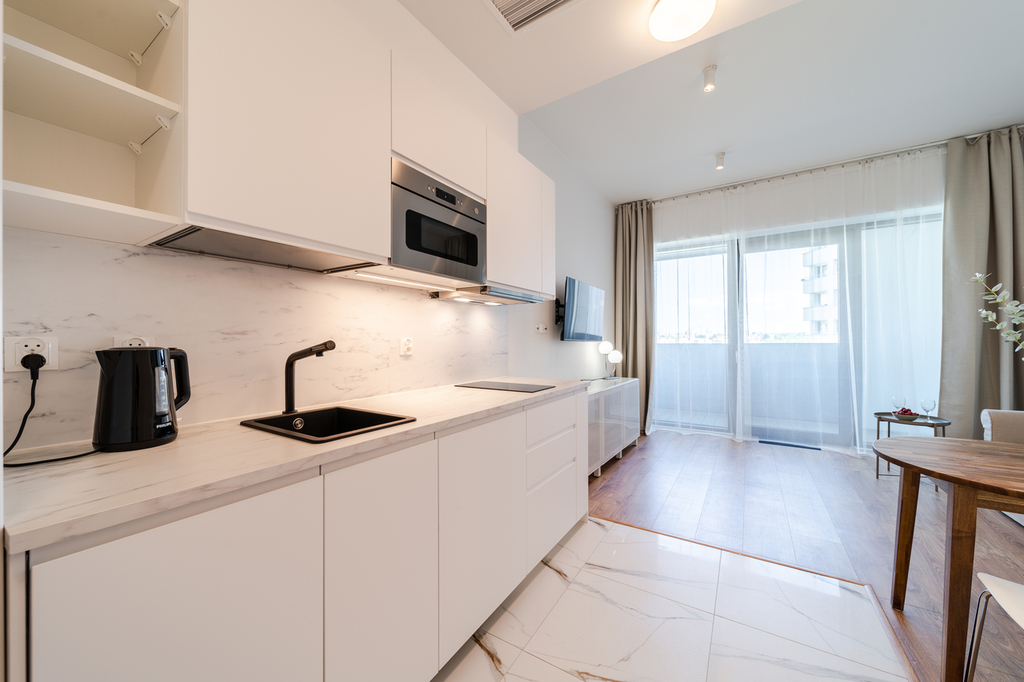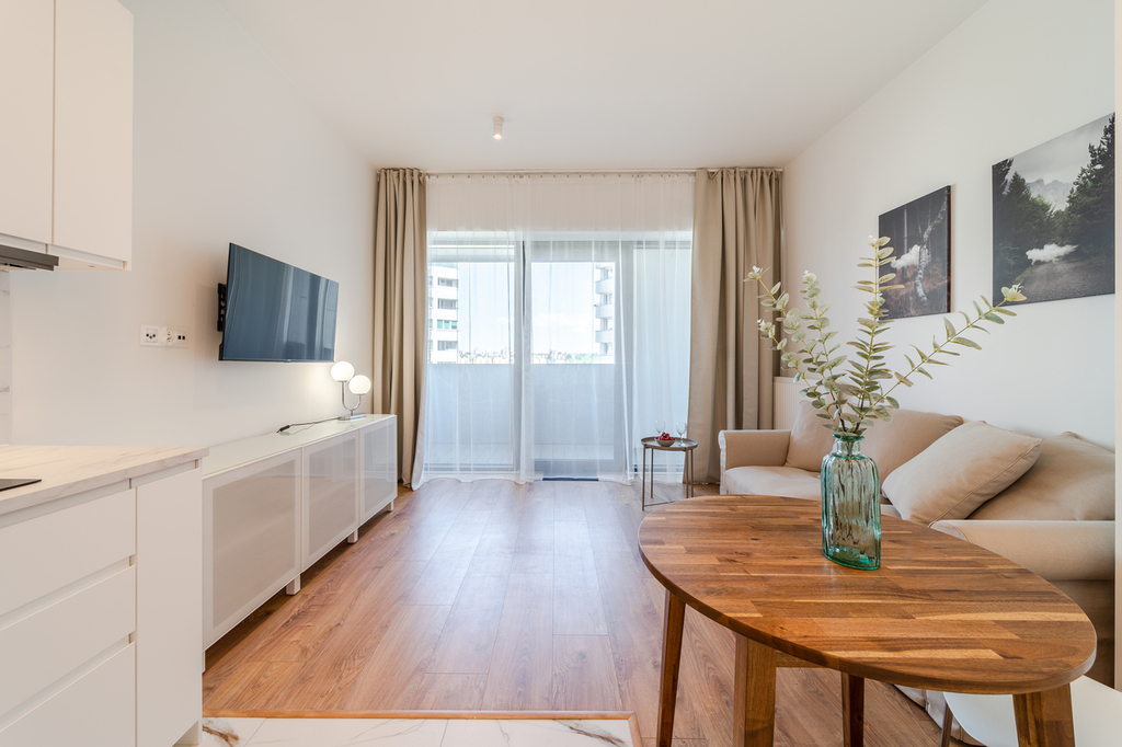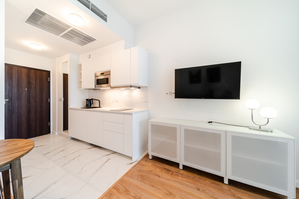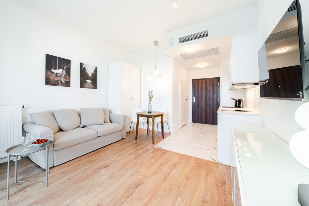 Apartment with an area of 25 m2 is located on the 4th floor of the building and consists of a living room with a kitchenette, a bathroom with a shower, a hall and a balcony. It is fully equipped with household appliances and electronics (washing machine, fridge with freezer, induction hob, microwave, cable TV, broadband Wi-Fi, hair dryer). Another undoubted advantage is air conditioning, which significantly increases comfort on hot days. Residents also have unlimited access to the spa area with an indoor swimming pool, jacuzzi, dry and wet sauna and a paddling pool for children (open from 7:00 a.m. to 10:00 p.m.). Additionally, residents have access to an observation deck on the 27th floor, from which you can admire the beautiful panorama of Szczecin while drinking coffee. There are also plans to include a gym and a playroom for children.