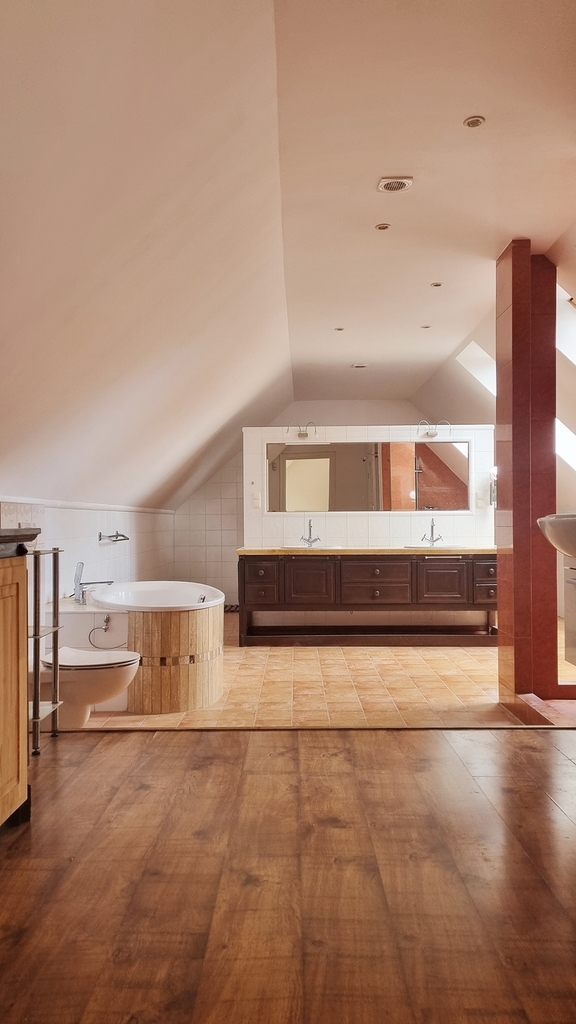 In the living room, the floors have been replaced with wooden ones, and the walls have been smoothed and painted (in the entire property) . Upstairs, there is parquet in the bedroom, carpet in the children’s rooms, and terracotta in the bathrooms.