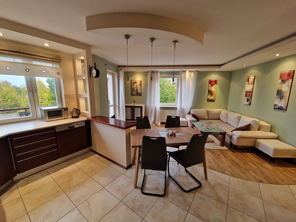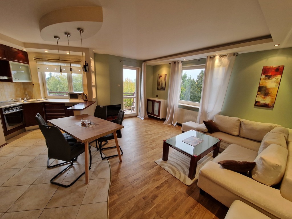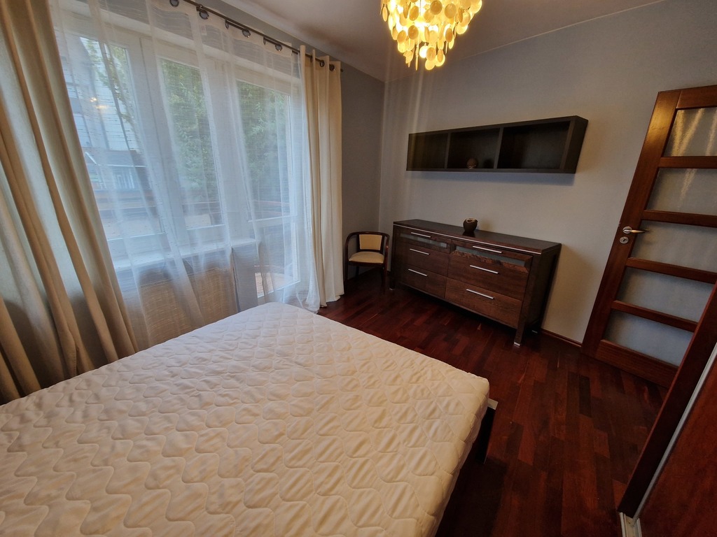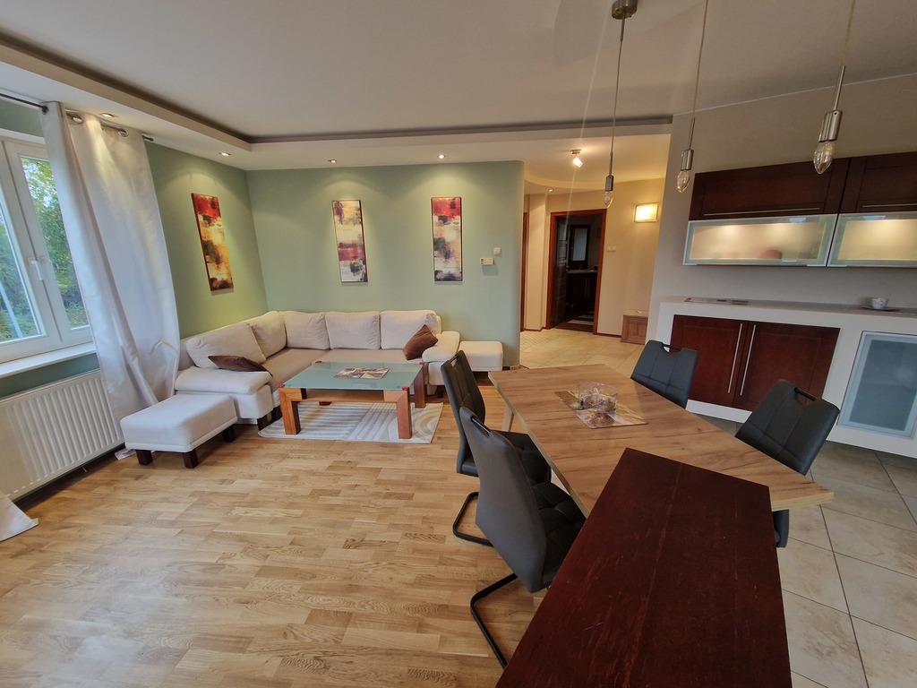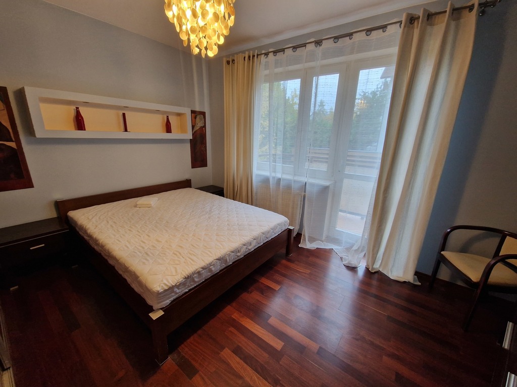 3-room apartment for rent, located on the border of Warsaw and Żelechów. The building was built in 2004 and is made of brick. Fenced area and closed parking for residents only. Lots of greenery in the estate, intimate atmosphere. The apartment is located on the 1st floor and has a beautiful view of the city skyline. The premises consist of: a spacious living room with a balcony and an open kitchen. The living room and kitchen are fully equipped and furnished (dishwasher, oven, fridge, hood). The master bedroom with a large built-in wardrobe (and a second balcony) and the second bedroom (unfurnished) which also has a wardrobe. There are two bathrooms, one with a bathtub and one with a shower. The apartment is refreshed and modernly finished. The rent for the community is PLN 377.44 (advance payments for water and garbage must be added – depending on the number of people), gas and electricity. Gas heating from a modern stove. 2-month deposit (PLN 6,400). Public parking spaces available behind a gate with a remote control for residents. We recommend! No animals. Available immediately.