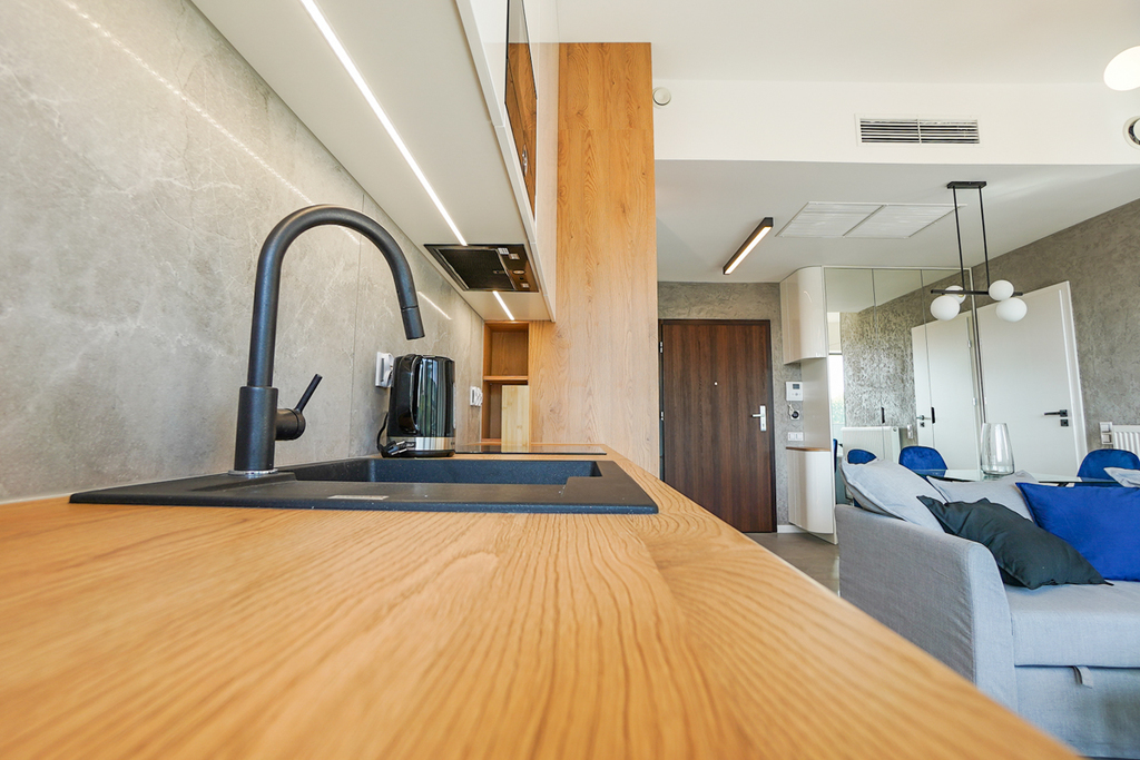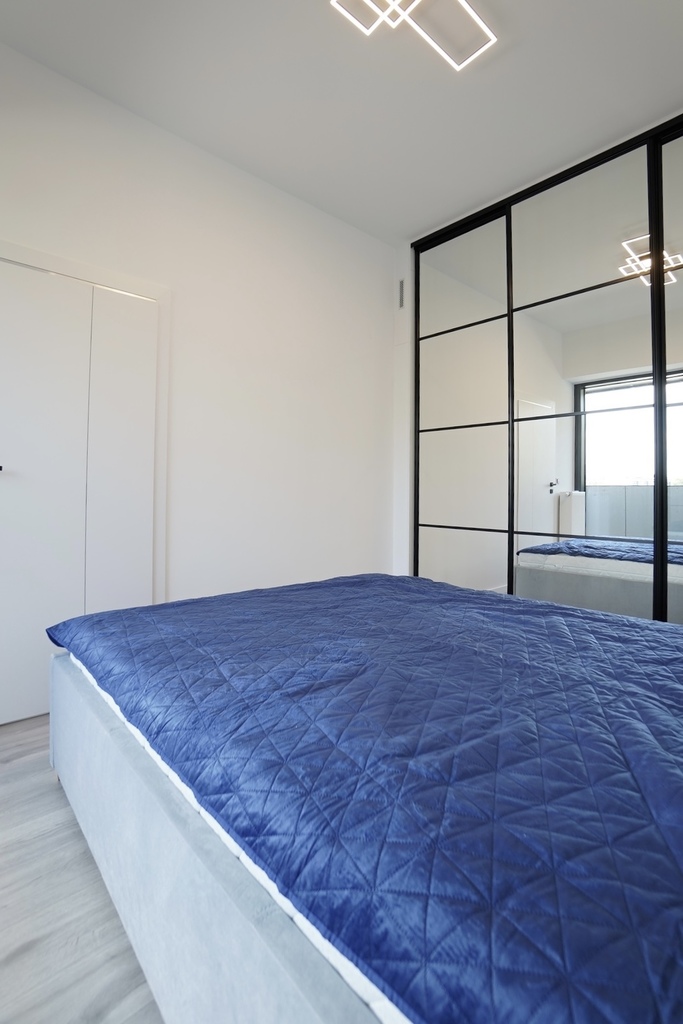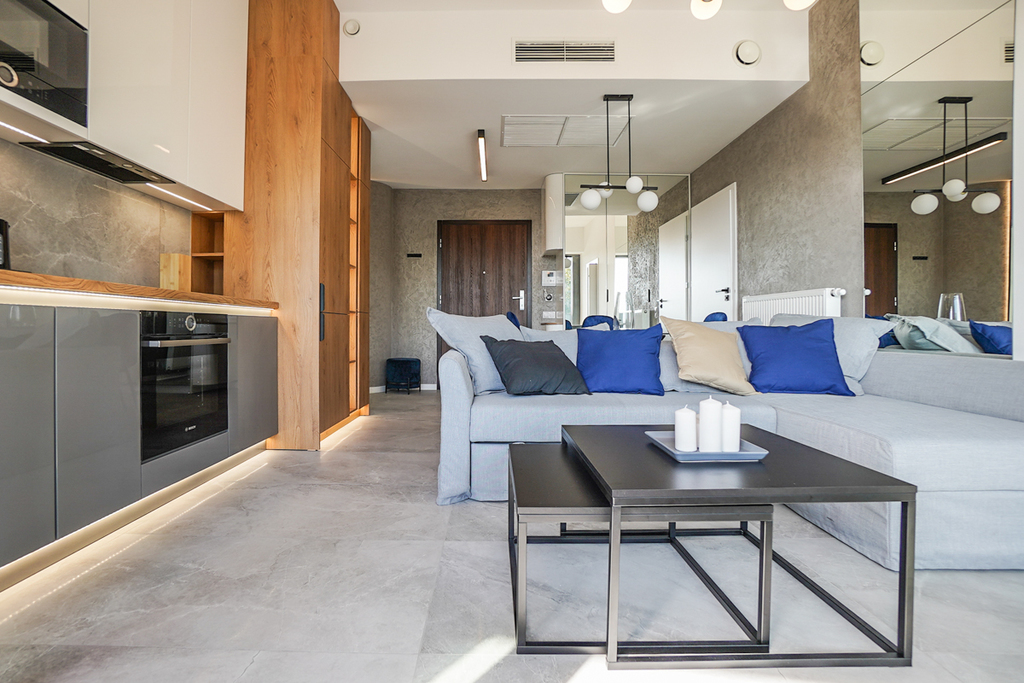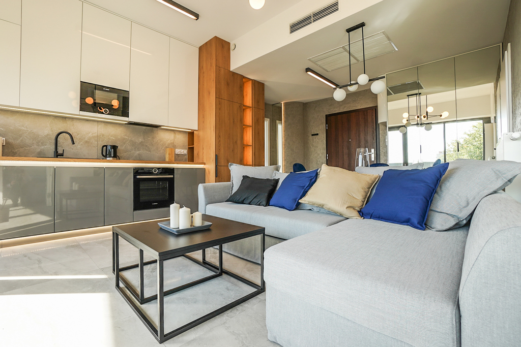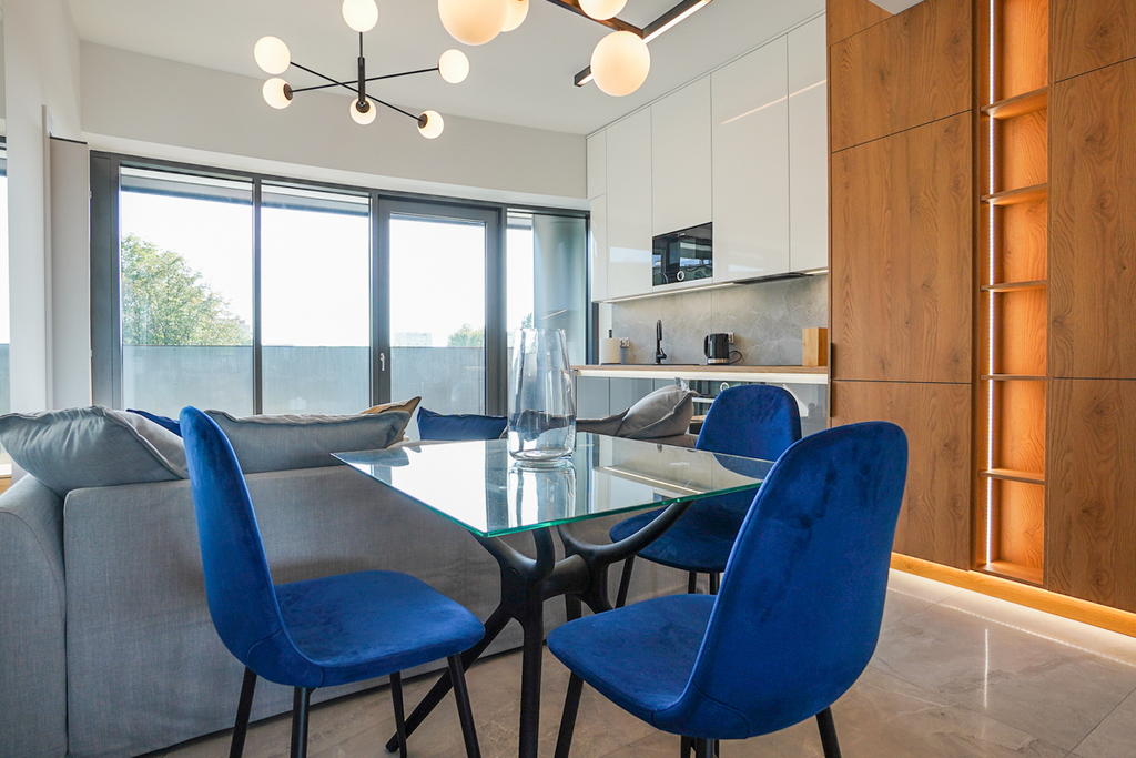 The interior of the apartment was designed by an architect who used colors and materials to create a coherent, elegant whole. The apartment consists of a living room lined with delicate gray tiles that perfectly match the color of the furniture. The grays are broken by the warm color of wood and cobalt blue accessories. The room is equipped with a built-in wardrobe, an illuminated mirror, additionally highlighted due to the gray structural wall background, a carefully thought-out kitchenette with a large number of drawers and shelves, and the external shelves are illuminated with warm light. Additional space is available in interesting rounded cabinets, which perfectly match the shape of the building and the pillars on the balcony, which are its inherent structural element. The kitchen is fully equipped with the latest household appliances, including a fridge with freezer, oven, microwave, dishwasher, sink, induction hob, kettle and hood. The open space includes a seating area with a comfortable corner sofa, a plasma TV and a dining area. Unusual folding doors lead to the bedroom, thanks to which, despite opening them, the room remains full of natural light and space. The bedroom is equipped with a double bed and a large built-in wardrobe. The second bedroom is also equipped with a built-in wardrobe; if necessary, the room can be used for, among others: a child’s bedroom or a home office. The bathroom is lined with light gray tiles and broken with dark graphite, equipped with a toilet, bidet, washbasin, washing machine and a large shower cabin.