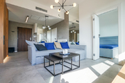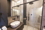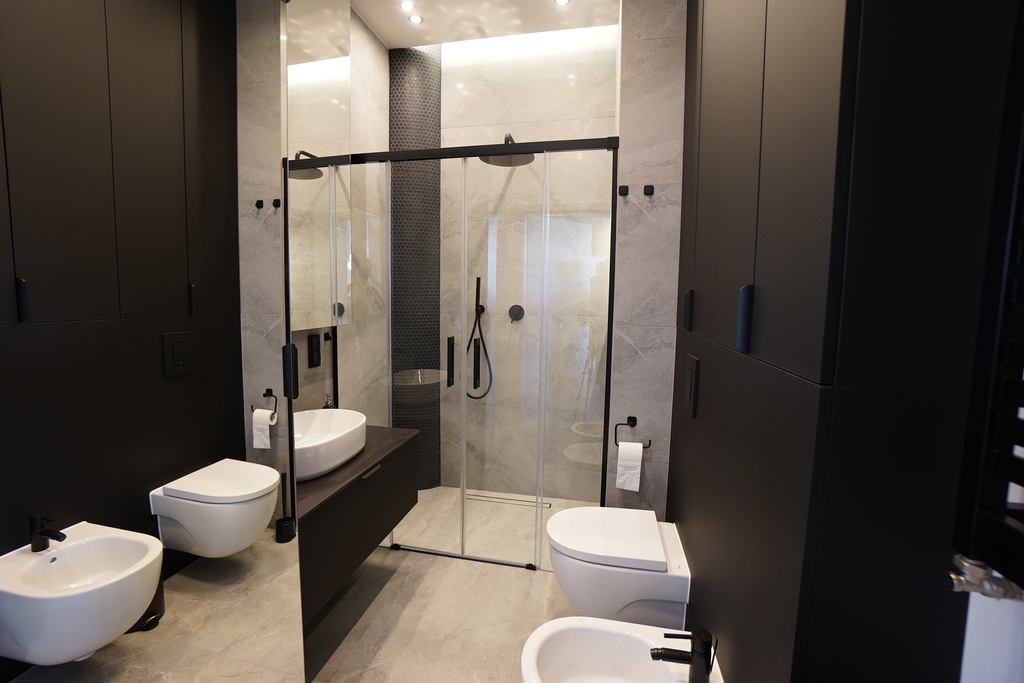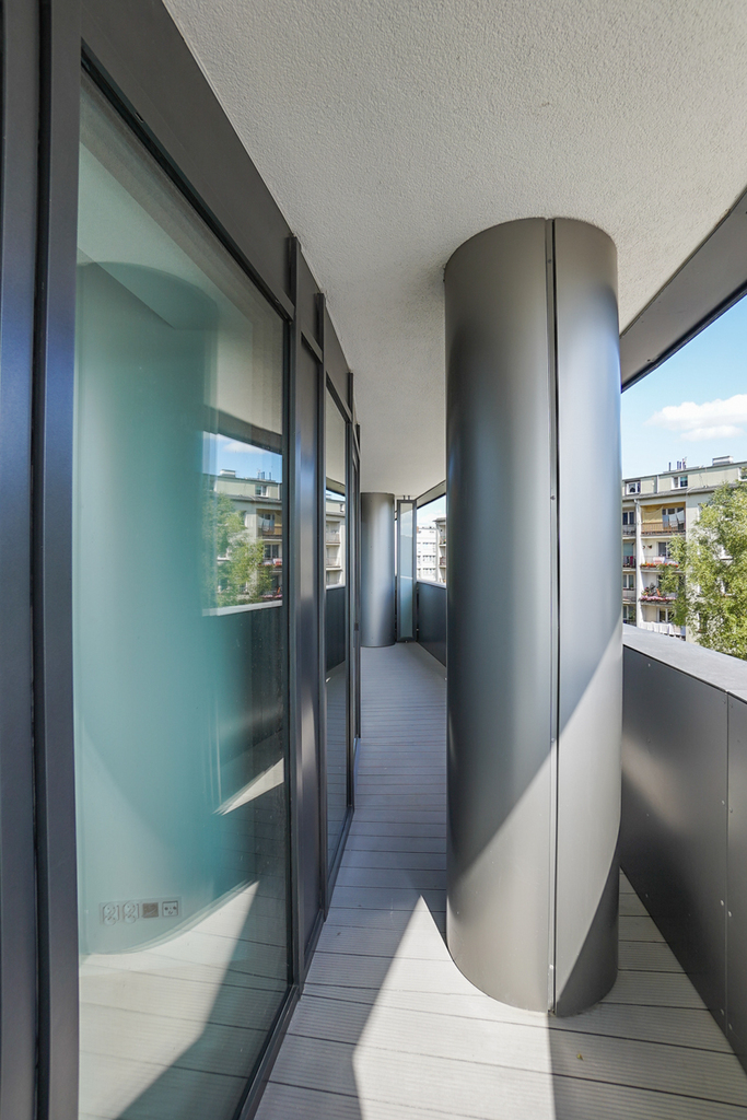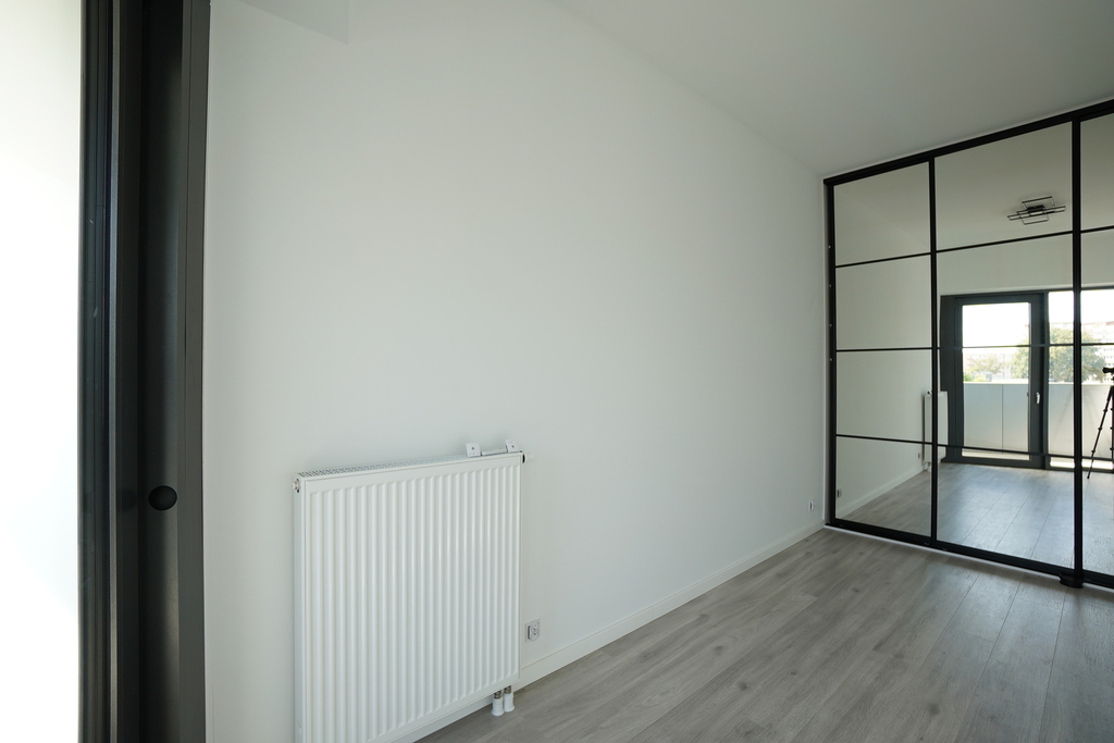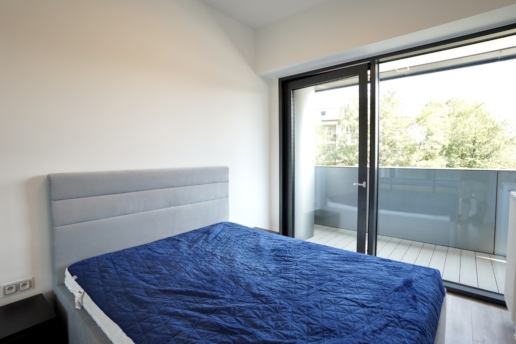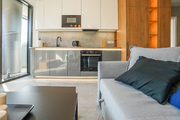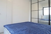 The interior of the apartment was designed by an architect who used colors and materials to create a coherent, elegant whole. The apartment consists of a living room lined with delicate gray tiles that perfectly match the color of the furniture. The grays are broken by the warm color of wood and cobalt blue accessories. The room is equipped with a built-in wardrobe, an illuminated mirror, additionally highlighted due to the gray structural wall background, a carefully thought-out kitchenette with a large number of drawers and shelves, and the external shelves are illuminated with warm light. Additional space is available in interesting rounded cabinets, which perfectly match the shape of the building and the pillars on the balcony, which are its inherent structural element. The kitchen is fully equipped with the latest household appliances, including a fridge with freezer, oven, microwave, dishwasher, sink, induction hob, kettle and hood. The open space includes a seating area with a comfortable corner sofa, a plasma TV and a dining area. Unusual folding doors lead to the bedroom, thanks to which, despite opening them, the room remains full of natural light and space. The bedroom is equipped with a double bed and a large built-in wardrobe. The second bedroom is also equipped with a built-in wardrobe; if necessary, the room can be used for, among others: a child’s bedroom or a home office. The bathroom is lined with light gray tiles and broken with dark graphite, equipped with a toilet, bidet, washbasin, washing machine and a large shower cabin.