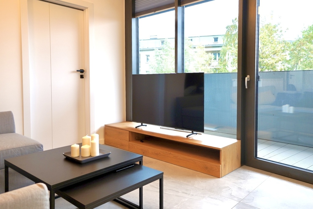 The interior of the apartment was designed by an architect, who used colors and materials to create a cohesive, elegant whole. The apartment comprises a living room with delicate gray tiles that perfectly complement the furniture. The gray tones are offset by warm wood and cobalt blue accessories. The room is equipped with a built-in wardrobe, a backlit mirror, further enhanced by the gray textured wall, and a carefully designed kitchenette with ample drawers and shelves, with external shelves illuminated by warm lighting. Additional storage space is provided by interesting, rounded cabinets that perfectly complement the building’s shape and the balcony pillars, which are an integral structural element. The kitchen is fully equipped with the latest appliances, including a refrigerator with a freezer, oven, microwave, dishwasher, sink, induction hob, kettle, and extractor hood. The open-plan space includes a lounge area with a comfortable corner sofa, a plasma TV, and a dining area. The bedroom is accessed through unusual folding doors, allowing for plenty of natural light and space even when open. The bedroom is equipped with a double bed and a large built-in wardrobe. The second bedroom also has a built-in wardrobe, and can be used as a child’s bedroom or home office, if desired. The bathroom is finished with light gray tiles and accented with dark graphite, and includes a toilet, bidet, sink, washing machine, and a large shower.