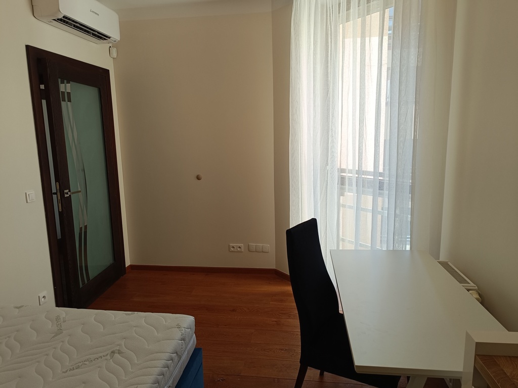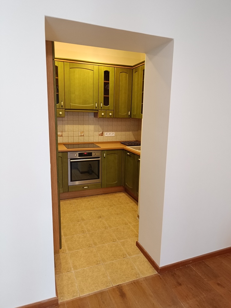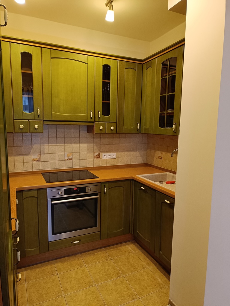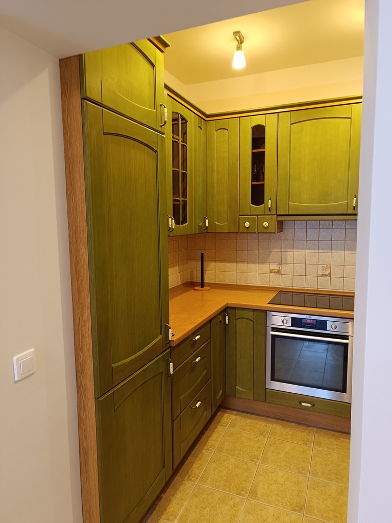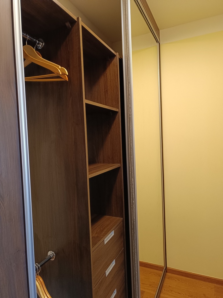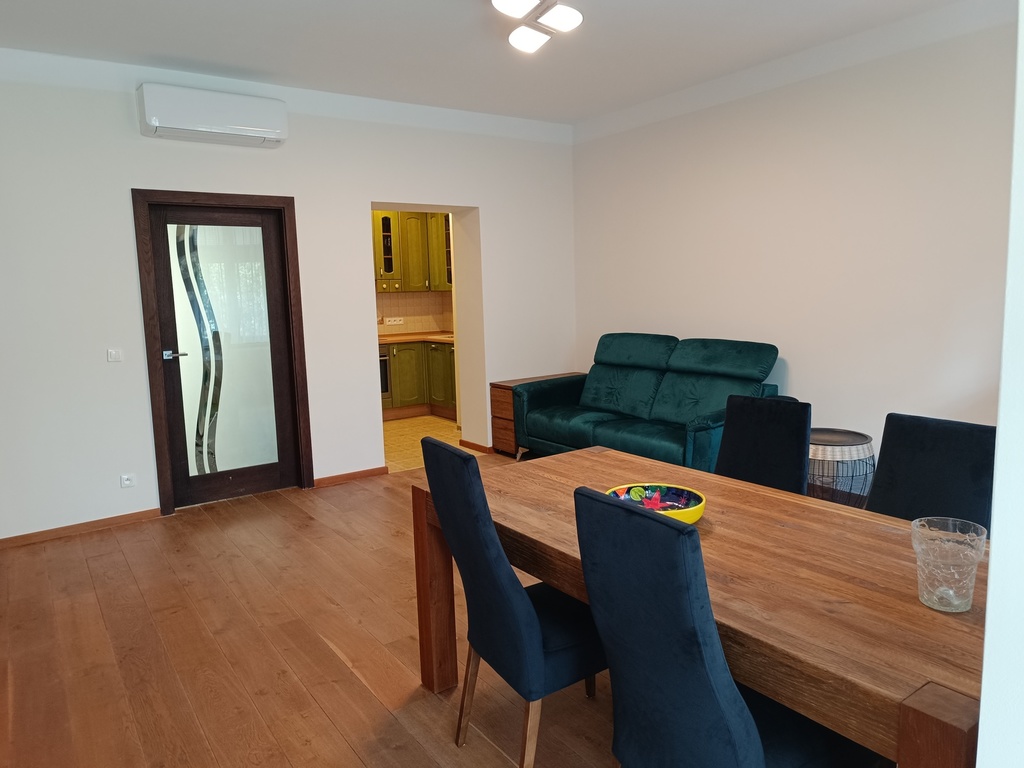 The apartment consists of: – living room with kitchenette, bay window facing the park, – two bedrooms, one with a large wardrobe, – hall, – bathroom with bathtub. The rooms have air conditioning. The apartment is renovated, new furniture and appliances. Heating and hot water – municipal.