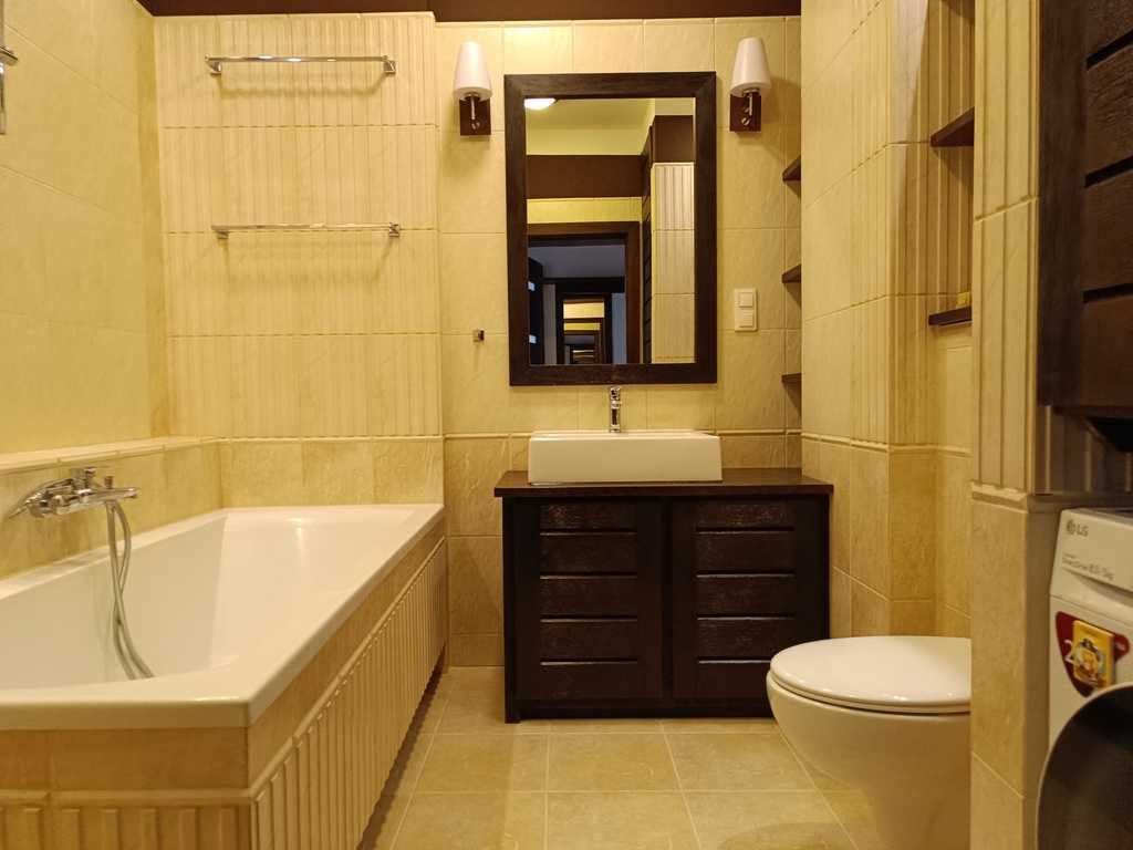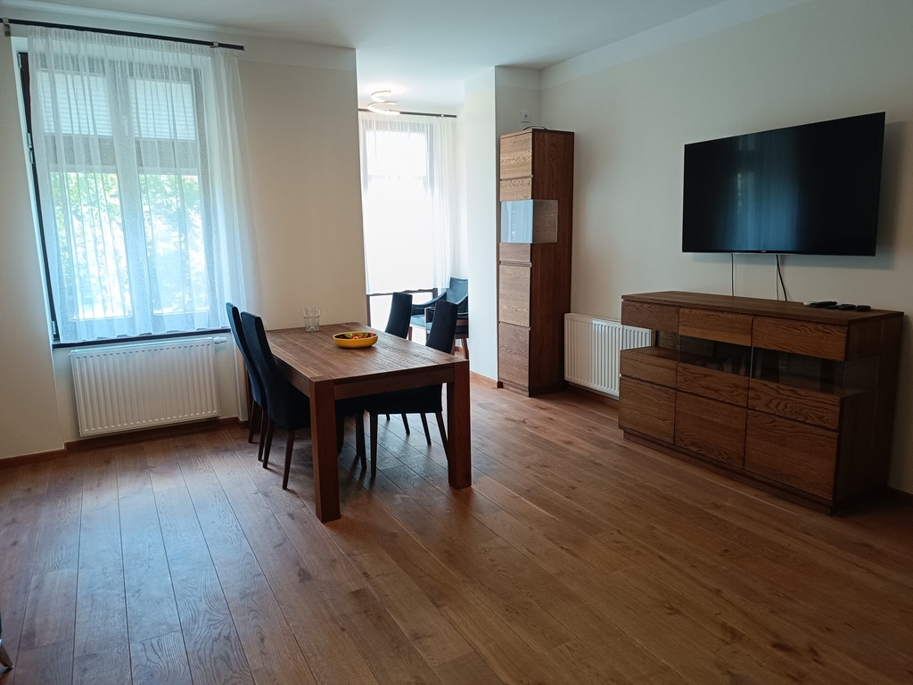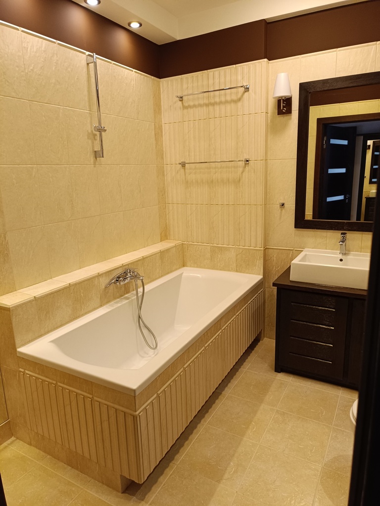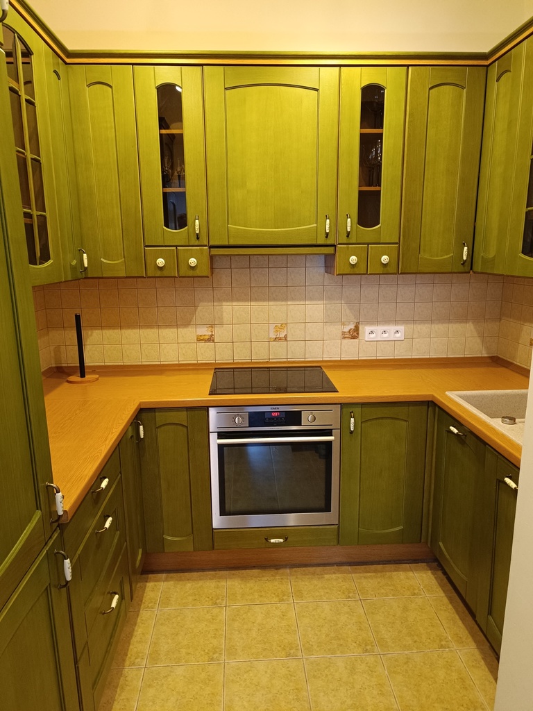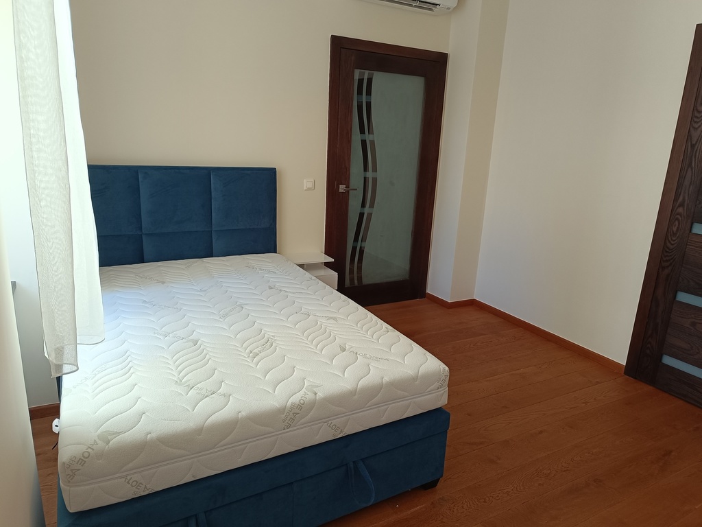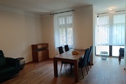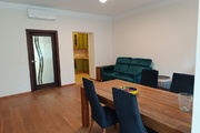 The apartment consists of: – living room with kitchenette, bay window facing the park, – two bedrooms, one with a large wardrobe, – hall, – bathroom with bathtub. The rooms have air conditioning. The apartment is renovated, new furniture and appliances. Heating and hot water – municipal.