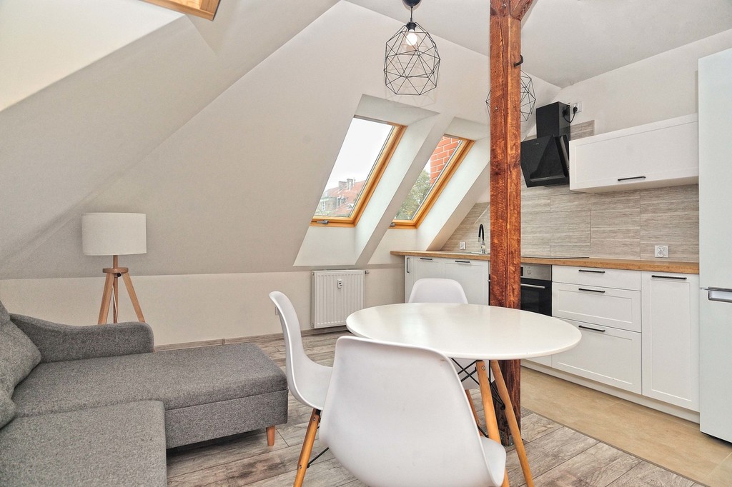 note – the apartment has been rented until the end of April 2024. Possibility to buy an apartment with tenants or sign a contract with the possibility of selling it after the end of the lease. Are you looking for a unique apartment? Do you want to have a park just around the corner and at the same time comfortable life close to the city center? You don't have time for renovation? This offer is for you! A completely new apartment, ready to move in, waiting for a new owner. We present a 2-level apartment with heating and hot water from the municipal network. There is a straight exit from the building to Kasprowicz Park next to Jasne Błonia! it is a place of many summer events and attractions. The summer theater and Rusałka Lake are just some of the advantages of this unique location. DESCRIPTION: The apartment has an area of 40.57 m2, has 2 levels and consists of a living room with a kitchenette, a hall, a bathroom with a toilet and another room located in the attic (second level). BUILDING – Renovated tenement house, staircase clean and well-kept. New roof finished with ceramic tiles. The building is insulated. LOCATION Near the greenery. The apartment is located on a quiet short street – ul. Zaciszna, right next to Kasprowicz Park. This guarantees residents excellent communication and access to numerous city attractions, and in their free time the opportunity to spend time in the bosom of nature (picnics, walks within easy reach). SURROUNDINGS In the near future, the revitalization of part of Kasprowicz Park / near Zaciszna Street is planned. The project envisages a comprehensive reconstruction of part of Kasprowicz Park by: installing swings and new benches, installing monitoring, installing swings, a small playground for children, renovating the park stairs and installing handrails. Details under the link below: https://sbo.szczecin.eu/rewitalizacja-parku-kasprowicza-w-okolicy-ulic-juliusza-slowackiego-zacisznej-i-piotra-skargi Nearby there are numerous service and commercial outlets, a clinic, hospital, kindergartens, primary schools, high school; in addition, there are many MZK bus and tram stops and restaurants. COSTS: fees to the housing community together with the renovation fund amount to PLN 414.98 (this amount includes heating, cold and hot water from the municipal office). Additional charges are electricity only. SUMMARY I recommend it due to the standard of workmanship and price. We have the keys, the land and mortgage register without any encumbrances. Possibility to move in immediately after purchase. We invite