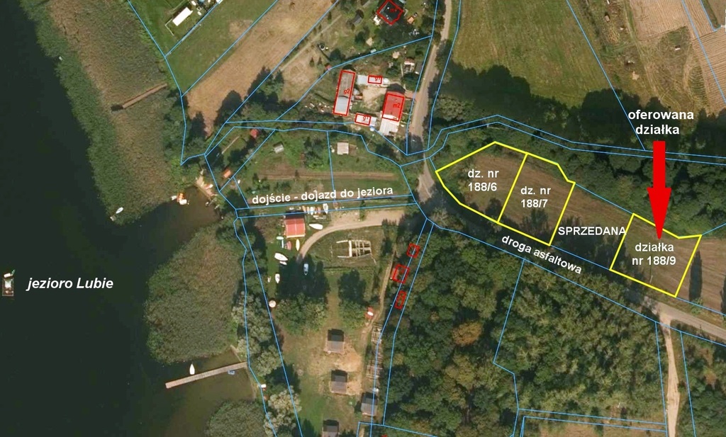 The offered plot is located on the outskirts of the holiday village of Gudowo, in the municipality of Drawsko Pomorskie, in the district of Drawsko, in the province Zachodniopomorskie, approx. 120 m from the generally accessible shore of Lake Lubie. Access to the lake via a communal road opposite the plot. The plot is located directly on the asphalt road.