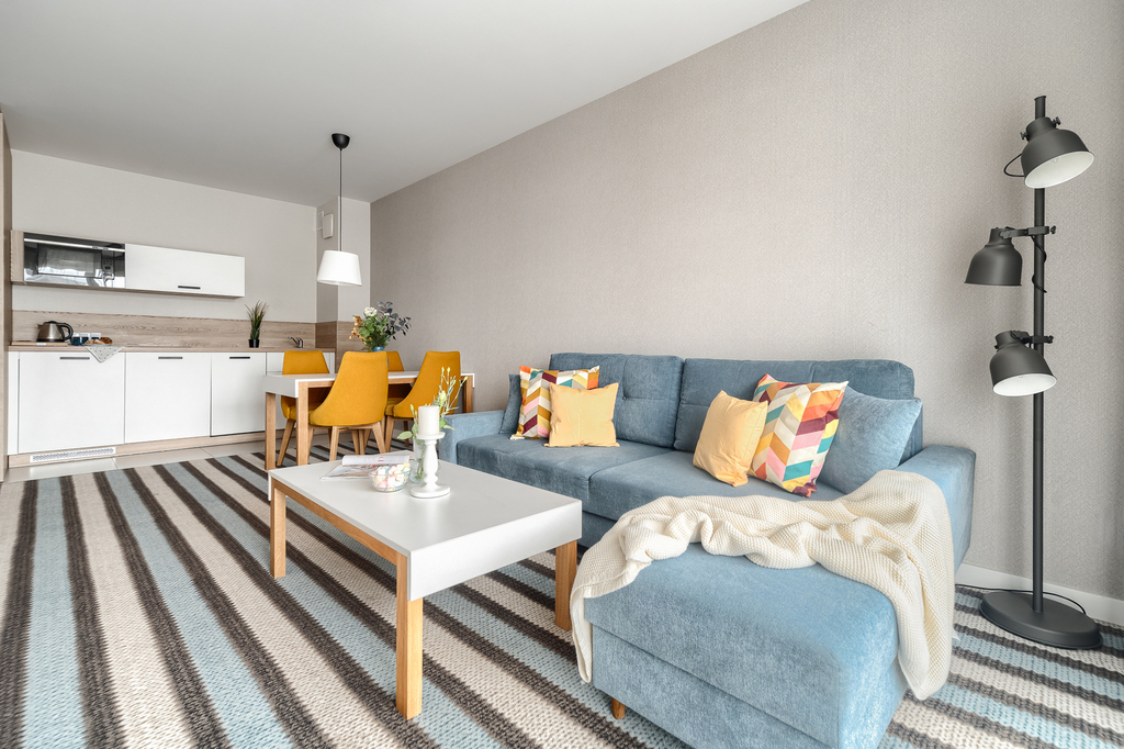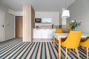 – room with kitchenette꞉ corner sofa, TV, TV cabinet, coffee table, table and 4 chairs,