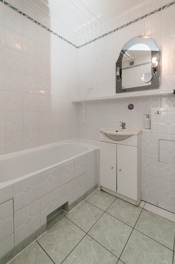 On the other side (facing the street), the smallest room is 10 sq m and a bright kitchen (kitchen furniture is included in the price, household appliances are negotiable). Bathroom with tiles and terracotta, well-kept.