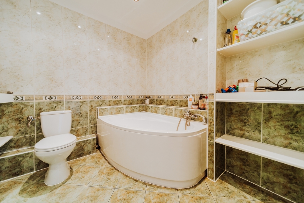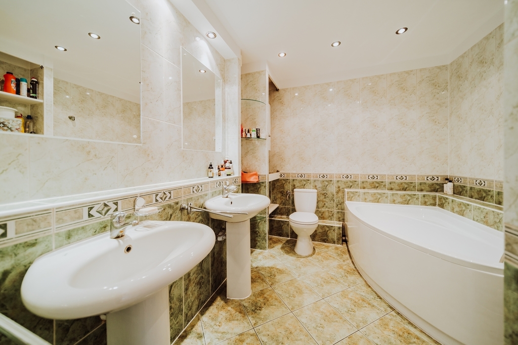 – a spacious bathroom with a bathtub, two sinks and a toilet;