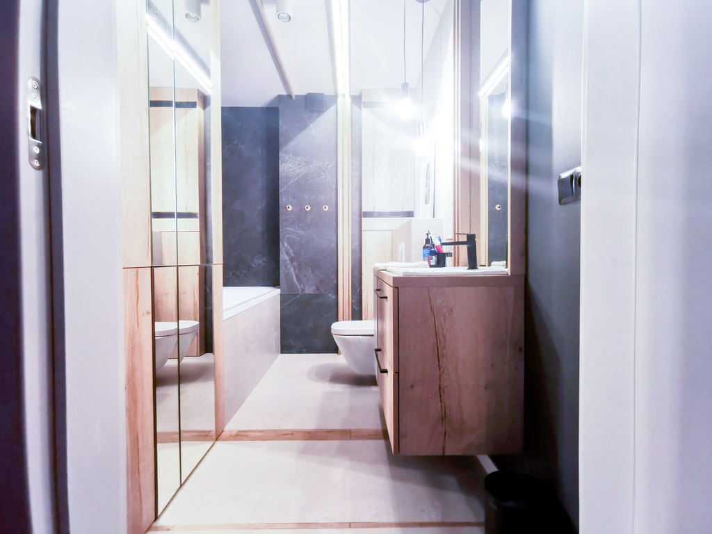 The kitchenette with an island is fully equipped, which makes everyday cooking easier, offering a dishwasher, an oven, an induction cooker in an increased size and a refrigerator.