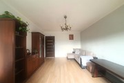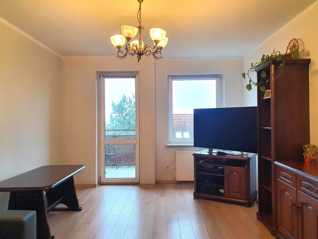 – a living room with a balcony facing the south, overlooking the Odra River, equipped with a corner sofa, a chest of drawers, a display cabinet, a wardrobe and a table