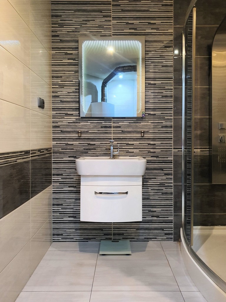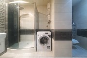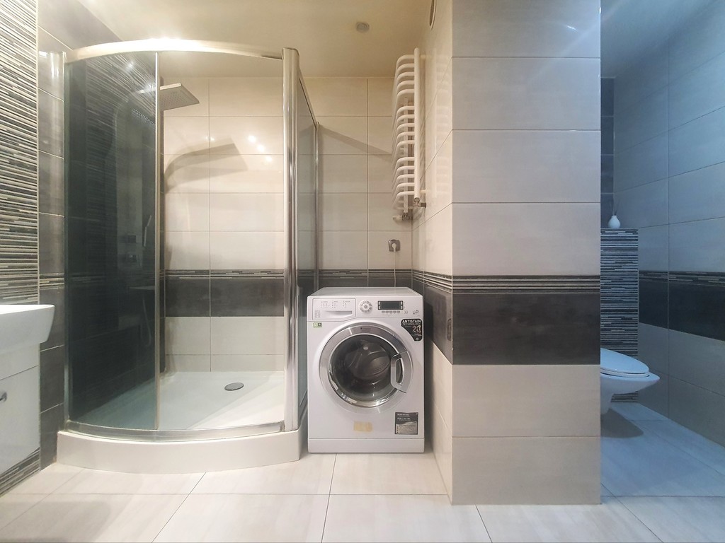 – centrally located large bathroom with a shower cabin, washbasin with hanging cabinet, toilet and a modern washing machine