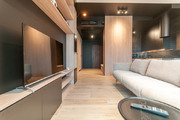 Living room with a kitchenette with windows spanning the entire width and height of the room, kitchenette with household appliances – fridge-freezer, induction hob, dishwasher, microwave, oven, hood, large comfortable stone countertop.