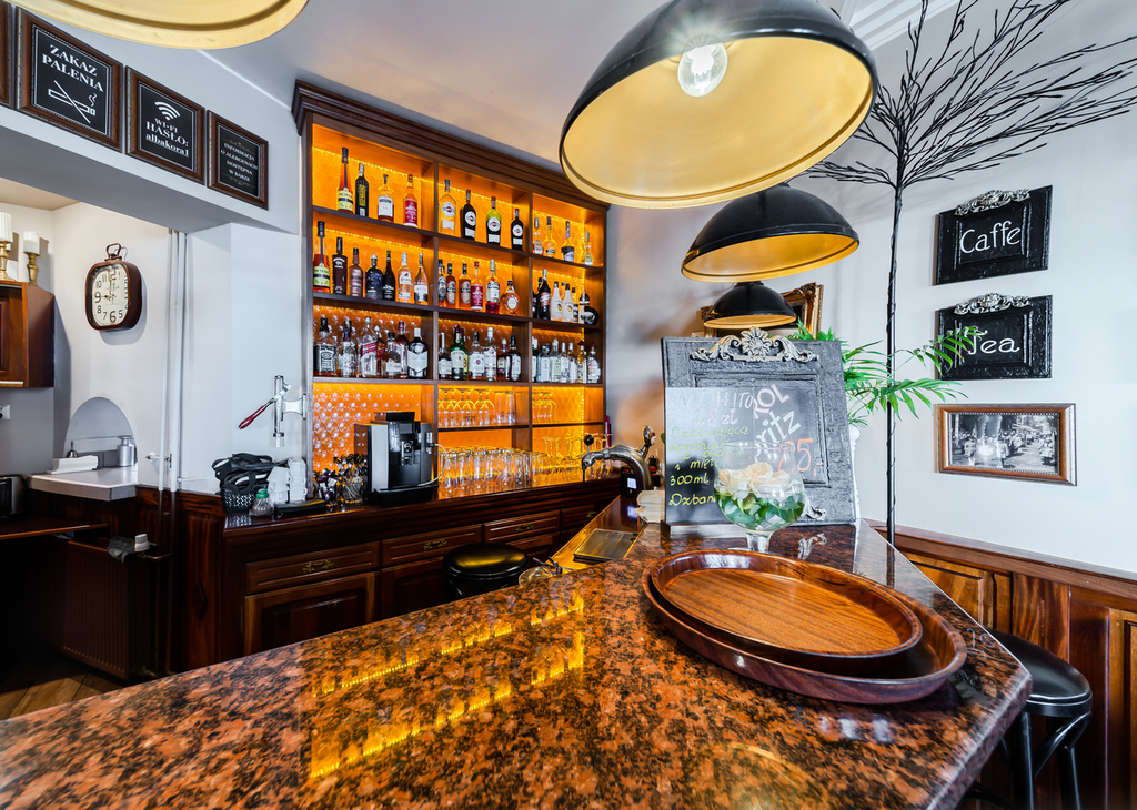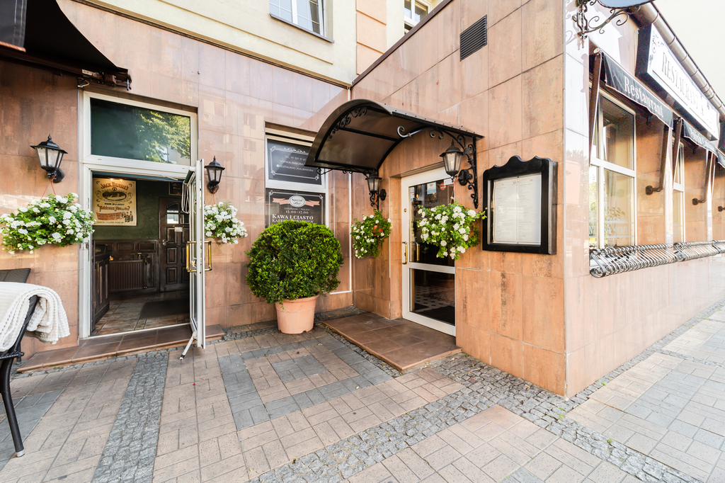 Large display windows in the dining room and drink bar are on the south-west side, while in the back room they are on the north-east side. Thanks to this, the restaurant is well exposed to sunlight. In the yard (from the back room) there is a designated parking lot for restaurant employees with entry through a remote control barrier. Parking spaces for guests are available from the street.