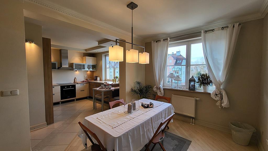 The subject of the offer is a 4-room, 2-level apartment with an area of 108.20 m2, located on the 3rd floor of a low-rise building from 2000 in the Majowe housing estate in the right-bank part of Szczecin.