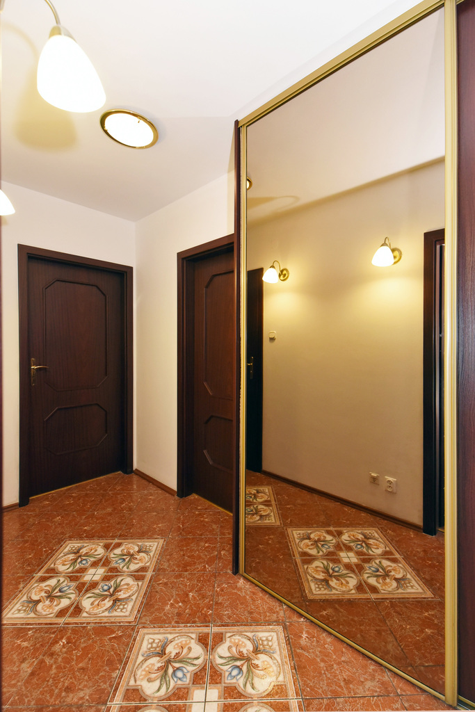In the hall there is a stoneware tile with an ornament on the floor ;