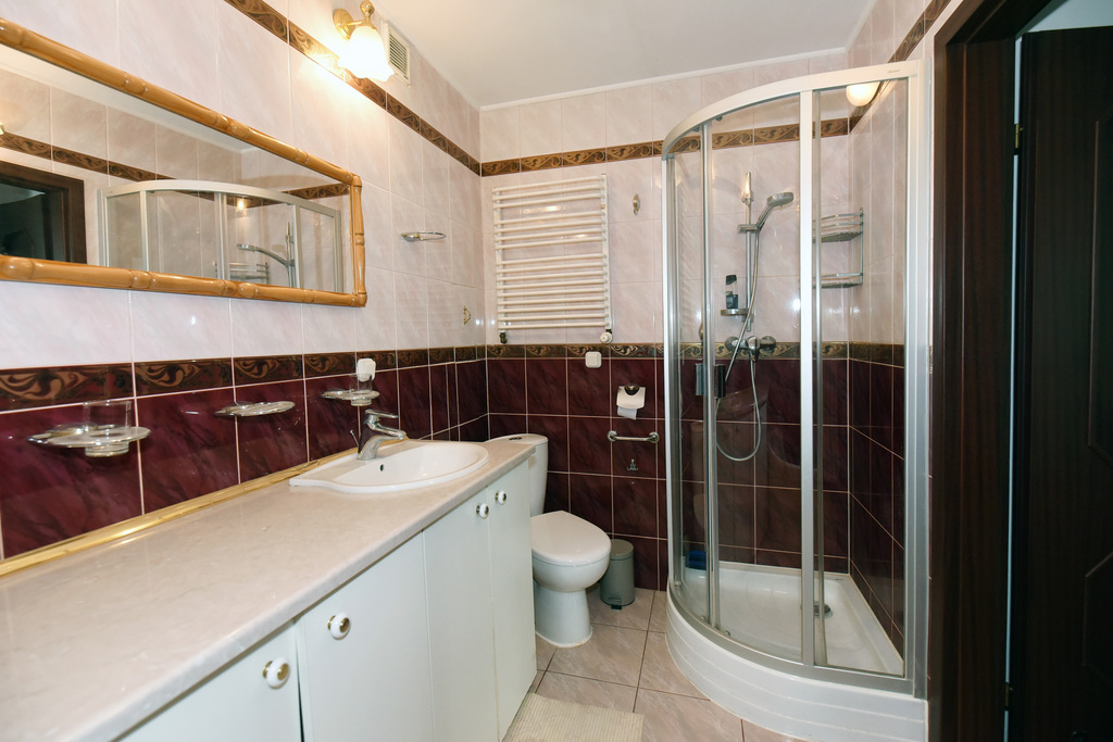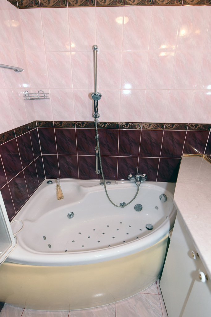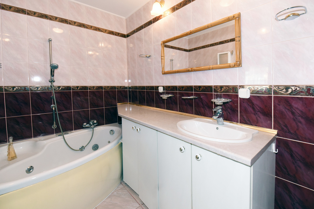 Bathroom: shower, hydromassage bathtub, built-in washing machine, walls – tiles, floor – terracotta;