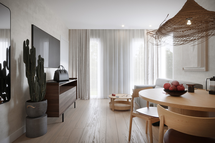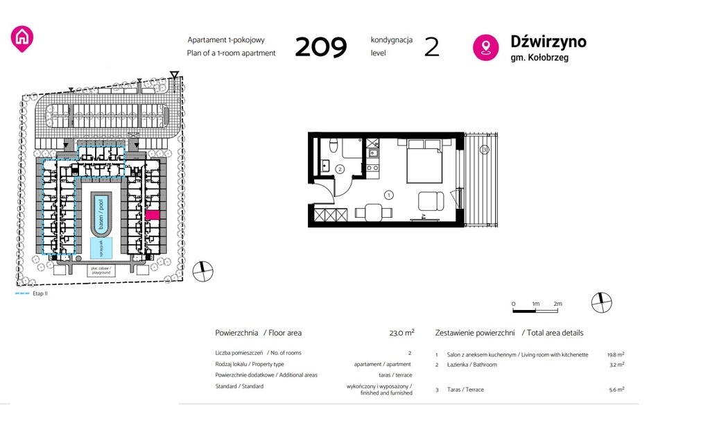 Offer without 2% PCC tax for the buyer. Pre-sale for apartments in stage I!!! Start of construction of stage I – Q2 2024, planned completion date of construction of stage I of the investment – March 2026. For sale: 1-room apartment with kitchenette, bathroom, fully furnished with an area of 23m², with a terrace of 5.6m2. Possibility to buy a ground parking space. Apartment sold with finishing and furniture of the highest standard and modern architectural solutions. The price in the offer is a gross amount, includes 23% VAT (with the possibility of deducting VAT by companies and individuals), for a finished and furnished premises. Low maintenance costs of the apartment – heating from a modern gas boiler room, electricity (including seasonal heating of the pool) from solar panels on the roof. New investment in Dźwirzyno surrounded by greenery, in a unique location – in the center of the resort and only 8 minutes walk to the beach. Distance from the seaside park – approx. 200 m. What distinguishes this investment: – High standard of finish and modern architecture – 2-story entrance hall – Digital key – an innovative system for opening doors using a mobile phone – Energy-saving elevator – Outdoor swimming pool – Water park for children – Relaxation zone with deckchairs – Playground – Photovoltaic panels – Chargers for electric cars In the investment – for sale 1, 2 and 3-room apartments with a mezzanine, with kitchenettes, finished and furnished in a seaside minimalist style with boho elements. Each apartment has a spacious balcony or terrace. Some premises located on the ground floor will have direct access to the swimming pool area (free use for owners). The premises can be purchased for your own use, as well as with the possibility of signing a contract with an experienced operator who will take care of the rental. We recommend – a unique, beautiful investment in premium quality. Ask us about availability and other meters. We invite you to contact us. The above offer is for information purposes and does not constitute a commercial offer within the meaning of Art. 66 §1 of the Civil Code