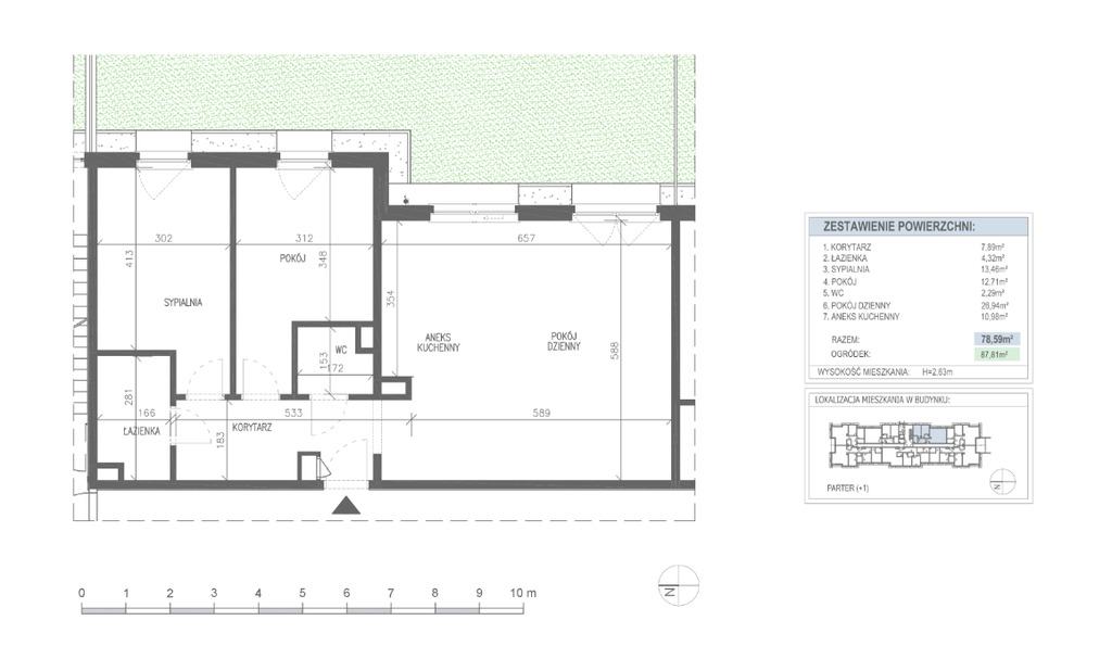 The presented three-room apartment with an area of 78.59 m2 is located on the ground floor and consists of: