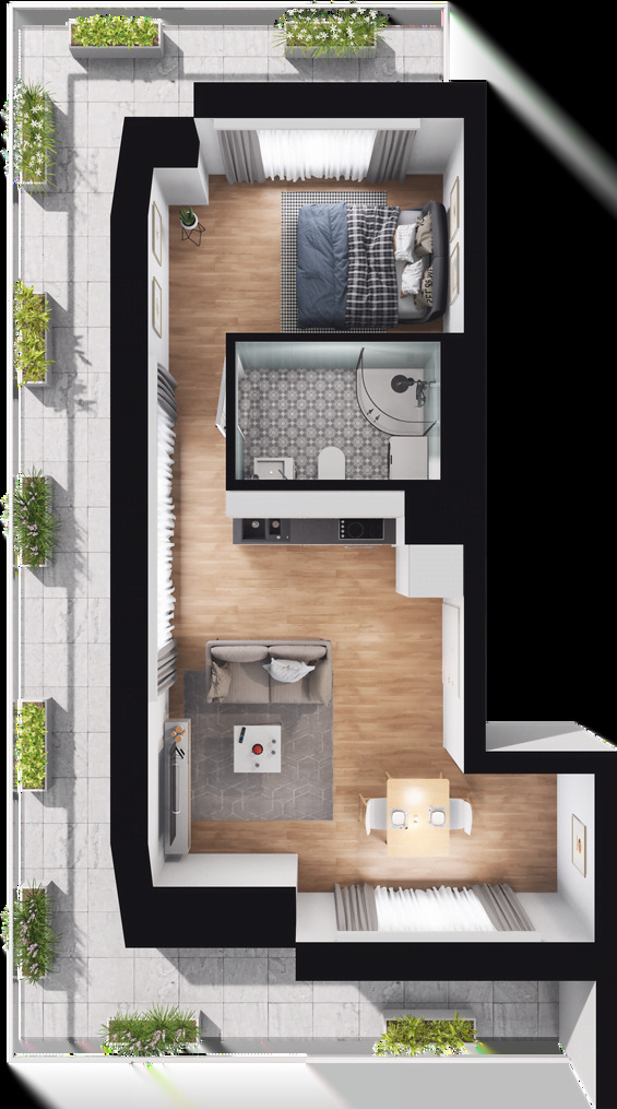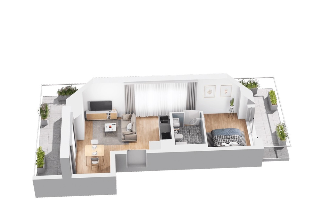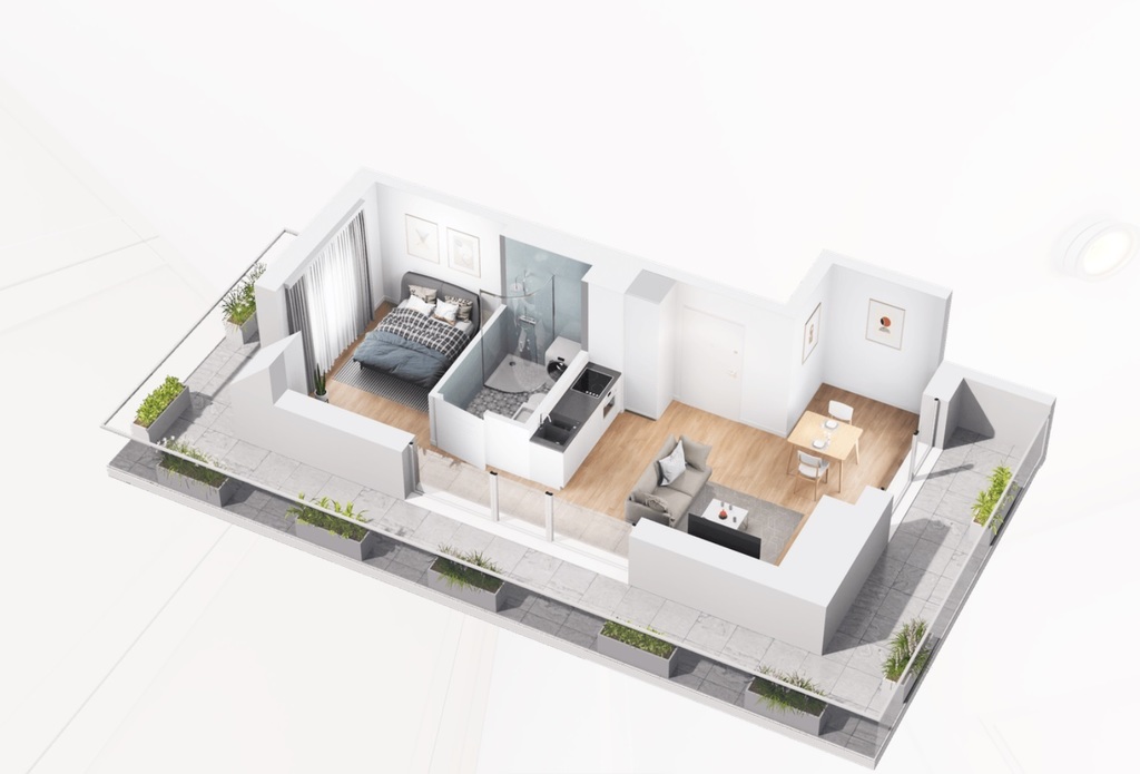 Apartments with an area of 33-37 m2 are located in two three-story buildings (from the ground floor to the second floor – attic). The properties were created thanks to the use of modern technologies and high-quality materials. Depending on the apartment you choose, you will enjoy views of two or even three sides of the world, which can be admired from the balcony or terrace. Additional advantages of the premises are their functional layout and naturally lit space.