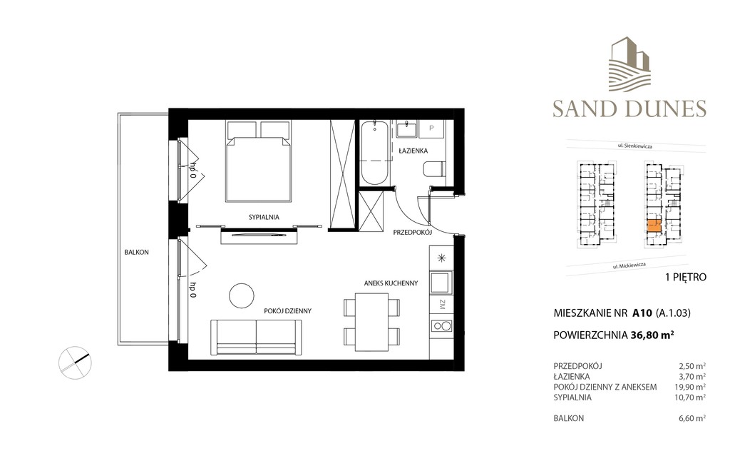 Apartment with an area of 36.8 m2 in a building located by the sea, first line from the beach. Living room with kitchenette 19.7 m2, bedroom 10.7 m2. Hallway 2.5 m2. Bathroom 3.7 m2. Balcony 6.6 m2. 1st floor. Sand Dunes in Dziwnów is an intimate investment consisting of two buildings with unique architecture located in an ideal location, in the first line of development, with a view of the Baltic Sea on one side and the Dziwna River and Wrzosowska Bay on the other. The investment is only 60 m away from the sea, and access to the beach directly from the investment area will meet the expectations of the most demanding customers. Possibility of finishing at the customer's request and rental management. There are charging stations for electric cars in the underground garage. Access to the garage by elevator. The four-story buildings will house 68 functional apartments with varying sizes from 36 m² to 100 m². Some apartments located on the ground floor will have maintenance-free gardens, and apartments on upper floors will have spacious balconies or terraces. Luxury apartments on the top floor will also have access to individual terraces on the roof of the building. The facility includes a dry sauna, gym and Kidsclub. The apartment will be available in 2024, turnkey finishing possible.