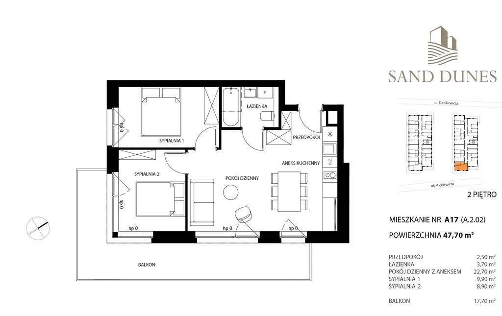 3-room apartment with an area of 47.7 m2 with a view of the bay in a building located by the sea, first line from the beach. Living room with kitchenette 22.7 m2, bedroom 9.9 m2 and 8.9 m2. Hallway 2.5 m2. Bathroom 3.7 m2. Balcony 17.7 m2. 2nd floor. Sand Dunes in Dziwnów is an intimate investment consisting of two buildings with unique architecture located in an ideal location, in the first line of development, with a view of the Baltic Sea on one side and the Dziwna River and Wrzosowska Bay on the other. The investment is only 60 m away from the sea, and access to the beach directly from the investment area will meet the expectations of the most demanding customers. Possibility of finishing at the customer's request and rental management. There are charging stations for electric cars in the underground garage. Access to the garage by elevator. The four-story buildings will house 68 functional apartments with sizes ranging from 36 m² to 100 m². Some apartments located on the ground floor will have maintenance-free gardens, and apartments on upper floors will have spacious balconies or terraces. Luxury apartments on the top floor will also have access to individual terraces on the roof of the building. The facility includes a dry sauna, gym and Kidsclub. The apartment will be available in 2024, turnkey finishing possible.