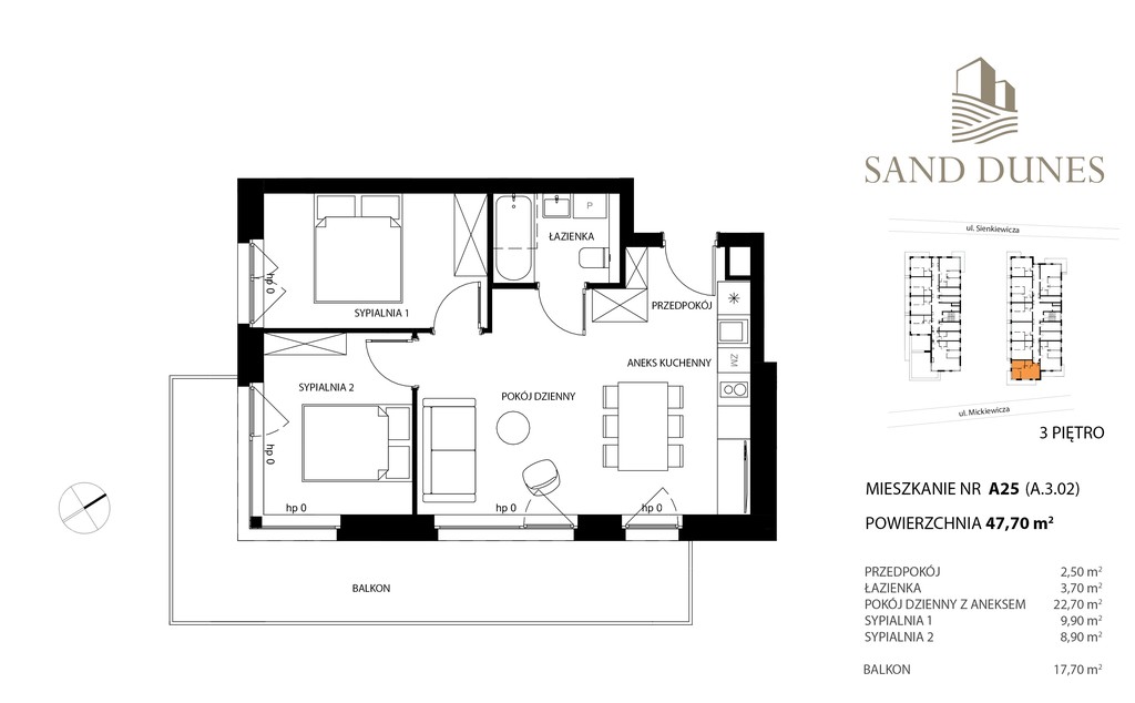 3-room apartment with an area of 47.7 m2 with a view of the bay in a building located on the first line by the sea. Living room with kitchenette 22.7 m2, bedroom 9.9 m2. and 8.9 m2. Hallway 2.5 m2. Bathroom 3.7 m2. Balcony 17.7 m2. 3rd floor. Sand Dunes in Dziwnów is an intimate investment consisting of two buildings with unique architecture located in an ideal location, in the first line of development, with a view of the Baltic Sea on one side and the Dziwna River and Wrzosowska Bay on the other. The investment is only 60 m away from the sea, and access to the beach directly from the investment area will meet the expectations of the most demanding customers. Possibility of finishing at the customer's request and rental management. There are charging stations for electric cars in the underground garage. Access to the garage by elevator. The four-story buildings will house 68 functional apartments with varying sizes from 36 m² to 100 m². Some apartments located on the ground floor will have maintenance-free gardens, and apartments on upper floors will have spacious balconies or terraces. Luxury apartments on the top floor will also have access to individual terraces on the roof of the building. The facility includes a dry sauna, gym and Kidsclub. The apartment will be available in 2024, turnkey finishing possible.