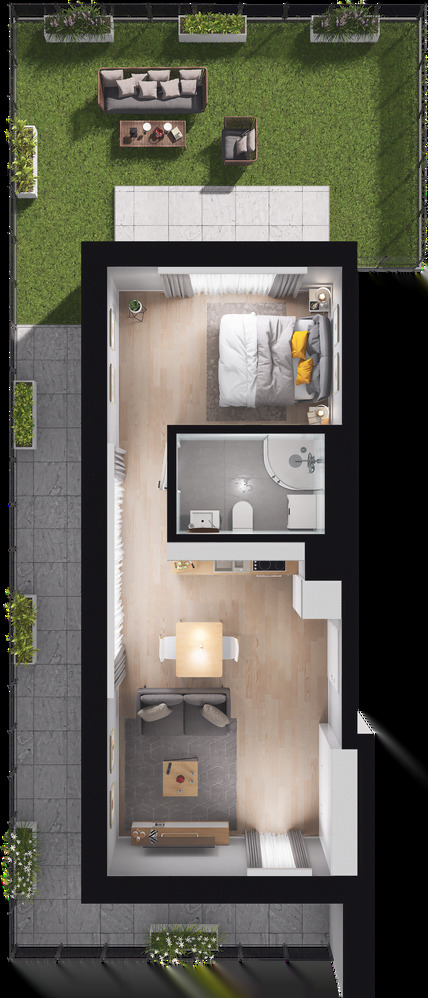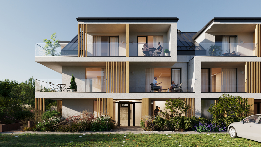 Apartments with an area of 33-37 m2 are located in two three-story buildings (from the ground floor to the second floor – attic). The properties were created thanks to the use of modern technologies and high-quality materials. Depending on the apartment you choose, you will enjoy views of two or even three sides of the world, which can be admired from the balcony or terrace. Additional advantages of the premises are their functional layout and naturally lit space.