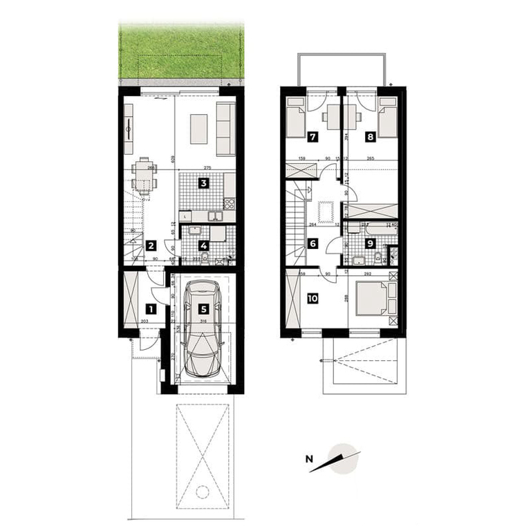 The entire house has triple-glazed PVC windows, on the ground floor in the living room there is a large HS type window – without threshold, with access to the garden. In the lower bathroom there is a WALK-IN shower with a linear drain, in the upper bathroom there is a bathtub with a screen. Heating from a 2-circuit gas stove – gas supplied only to the stove, no gas in the kitchen. There are radiators in the rooms and underfloor heating in the bathrooms. Each segment is equipped with an alarm system and intercom. Fiber optic cable has been connected to each property. Planned video monitoring of the entire estate. The visible interior furnishings remain included in the sale price!!!