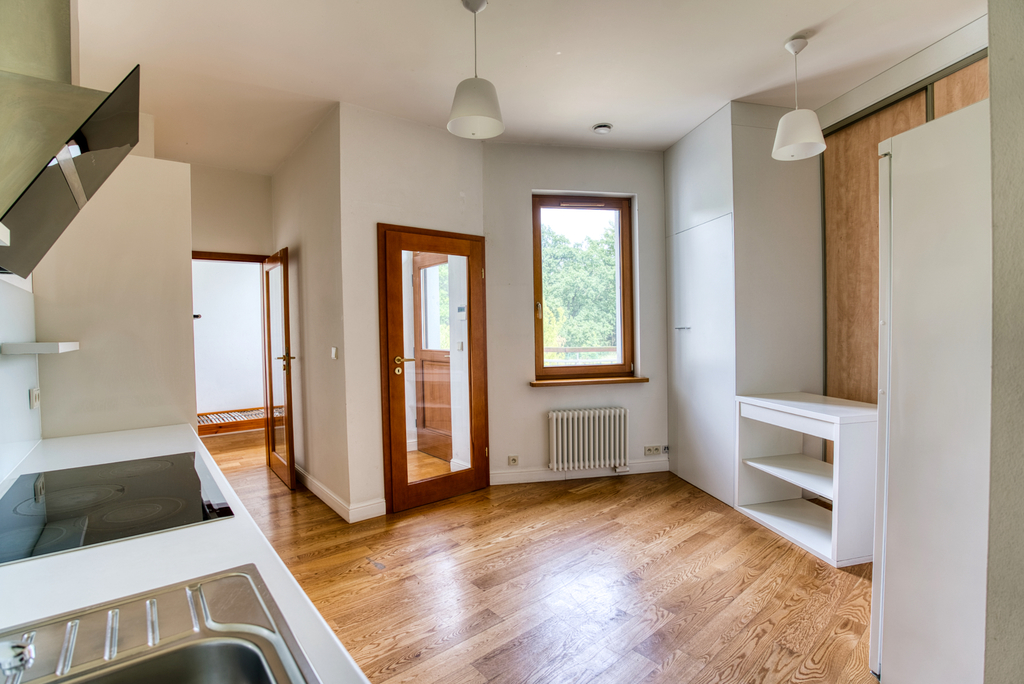 The living room flows smoothly into the open space where the kitchen and dining room are located, which are the heart of the house. Interestingly, this space is divided only by a double-sided fireplace that reaches all the way to the ceiling, giving a unique atmosphere to both the living room and the dining room. It is an ideal place to spend time together, cook and eat meals, where the glow of the fire adds warmth and charm to every meeting. You can also admire a beautiful view from the living room thanks to the mezzanine, which with its lightness contributes to the feeling of cozy space in this unique residence.