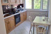 Scheduled apartment. A well-arranged kitchen with a window, equipped with built-in furniture and household appliances (included in the price). The bathroom is equipped with a shower cabin, washbasin, toilet, in tiles.