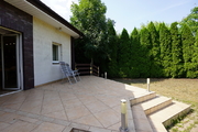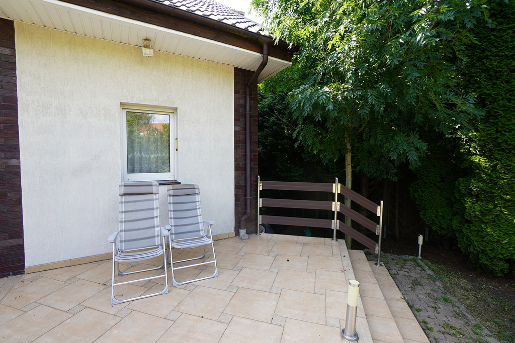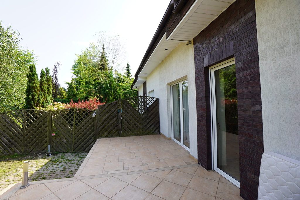 – living area (ground floor) with a vestibule, a corridor with a staircase leading to the first floor, a living room (living room), a kitchen with a dining room and a bathroom. A door leads from the living room to the front terrace (balcony). The dining area has two exits to the garden terrace – one direct, the other through the winter garden,