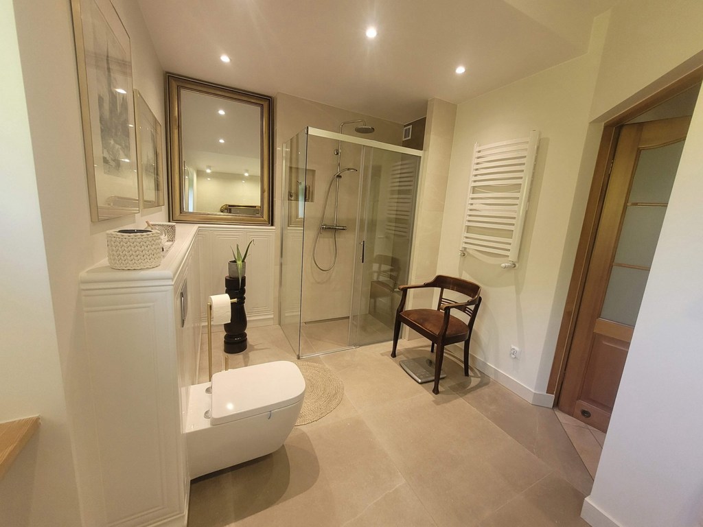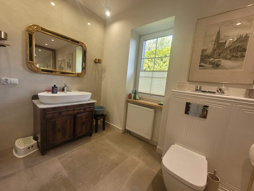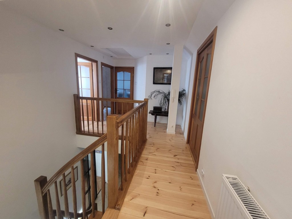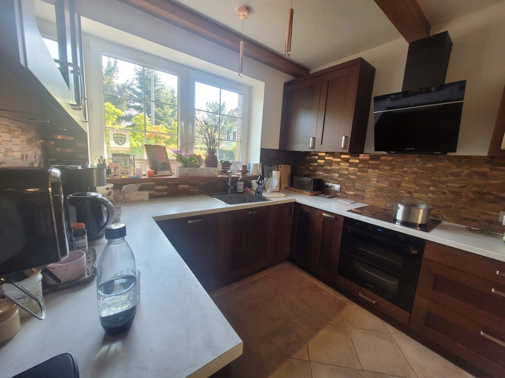 Bezrzecze, axis. Forest. Detached house with an area of 173 m2 of usable area and 210 m2 of total area with a garage for one car in the building. The house is located on a plot with an area of 797 m2, which has been beautifully developed with a gazebo, a brick grill and a large wooden farm house. There are numerous plantings in the garden and an underground irrigation system. One-story house with an attic after complete renovation in 2023. The roof is covered with ceramic tiles. On the ground floor, there is a large living room with a fireplace and access to the garden. A separate large kitchen with windows and balcony doors with access to the terrace. Built-in wooden kitchen furniture, household appliances (fridge, dishwasher, induction hob, electric oven, refrigerator), table, chairs. Next to the kitchen there is a comfortable utility room with shelves with an entrance from the hall. Additionally, on the ground floor there is a bright bathroom with a shower cabin in elegant tiles and terracotta, and an office room with an area of approximately 16 m2. Additionally, on the ground floor there is a washer and dryer room with a dual-function gas stove. There is oak parquet on the floor in the living room, pine boards in the other rooms, and terracotta in the hall, kitchen and bathrooms. A comfortable staircase with a light wooden structure leads to the first floor. On the first floor there are 3 bedrooms with small slopes, a dressing room and a bathroom with a slope with a bathtub and a shower. New PVC windows, smooth painted plaster on the walls. Well-kept house, in a beautiful location surrounded by greenery. There are numerous shops, a school and other public facilities nearby. I recommend it and invite you to the presentation.