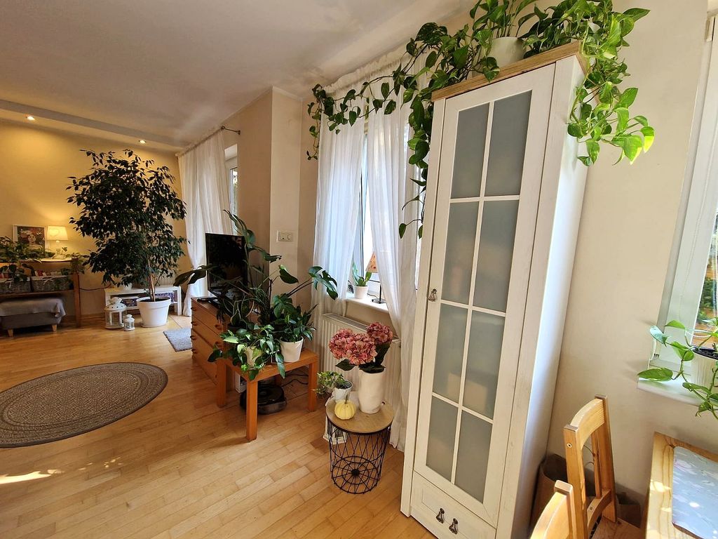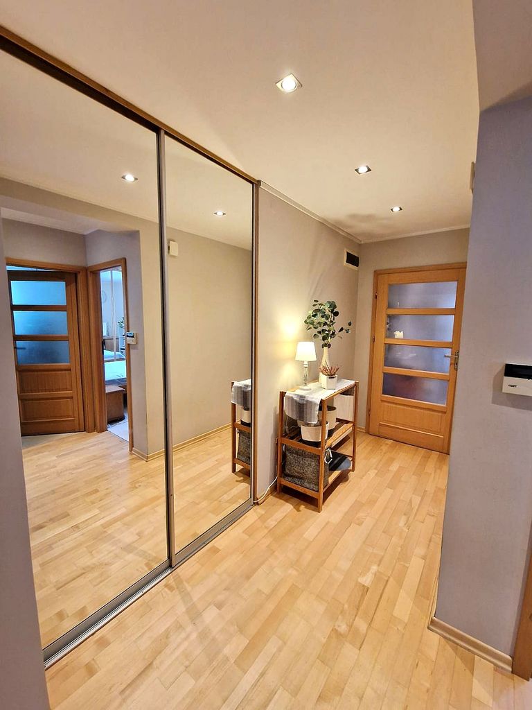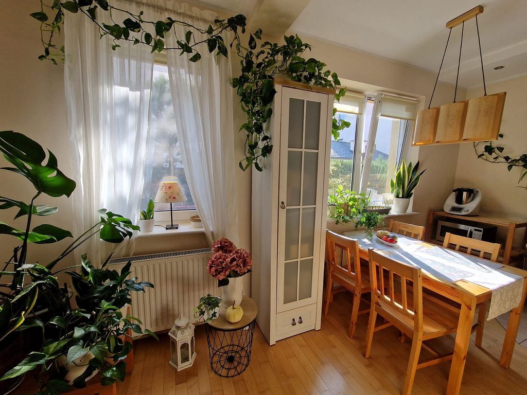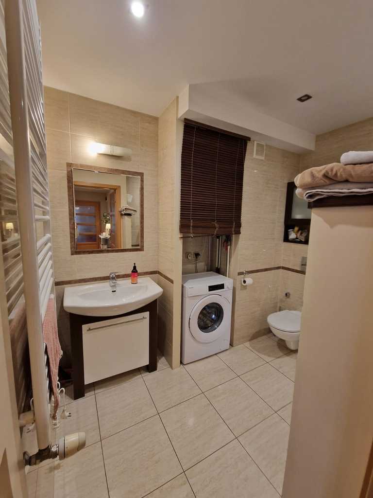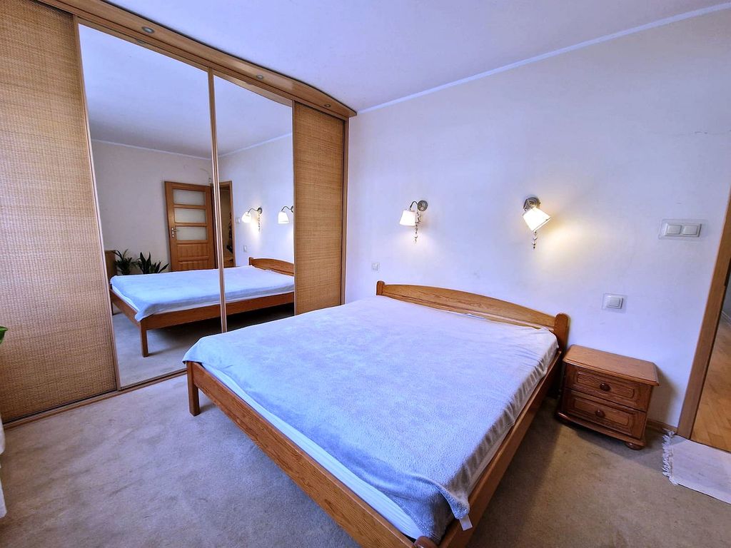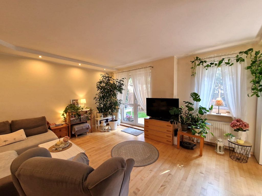 We offer for sale an elegant apartment in Gumieńce. The apartment is located on the ground floor of a two-story building built in 2005 in a very well-kept housing estate with a playground, consisting of 40 low-rise apartments. On an area of 85 m2 there are: – living room (22 m2) on the south side with access to a sunny terrace (20 m2) – bedroom (18 m2) on the north side – with a large wardrobe – bedroom (14 m2) on the east side with two windows and a view of the garden belonging to the apartment – kitchen (12 m2) with modern furniture, large Electrolux fridge with freezer, Siemens dishwasher, gas stove with Whirlpool glass hob, Whirlpool electric oven and a large table for six people – bathroom (5 m2 ) with a bathtub with a glass-aluminum structure enabling simultaneous use of the shower, rain shower, washing machine and compact toilet with bidet shower – large hall in the central part of the apartment and entrance to a separate dressing room. The apartment has individual gas heating, panel radiators, a Vaillant gas stove with a built-in tank. starter, Vaillant weekly programmer. The rent for the community is PLN 580, plus electricity and gas. High standard of finishing. Interior doors made of solid ash wood with opal glass. Anti-burglary windows and doors. Ash wood floors. Alarm installation with a system connected to monitoring (rooms inside the apartment and the possibility of connecting external barriers), video intercom. On the south side, a beautifully landscaped sunny garden with an area of 300 m2, a woodshed with lighting for bicycles, a lawn mower and a barbecue. Individual entrance to the apartment directly from the parking lot. Two private parking spaces included in the price of the property. Nice and unobtrusive neighborhood. I invite you to the presentation.