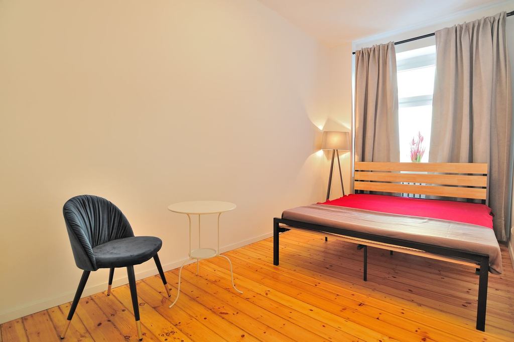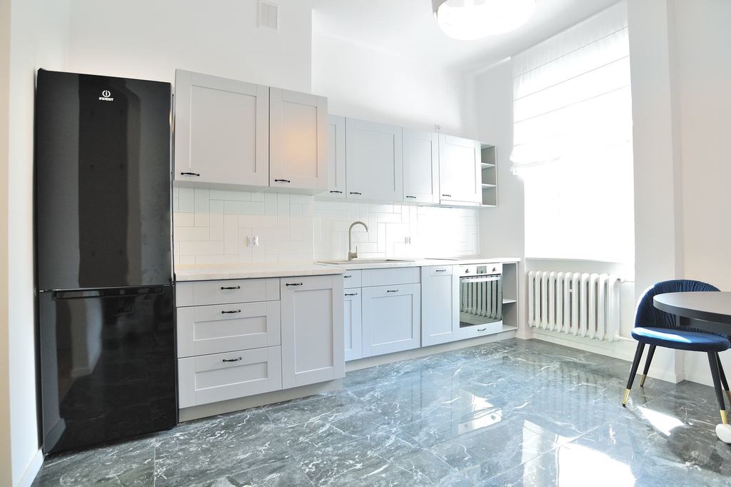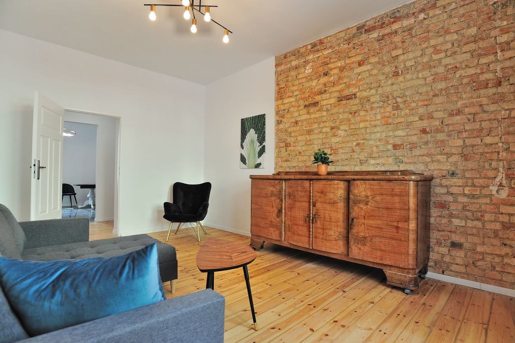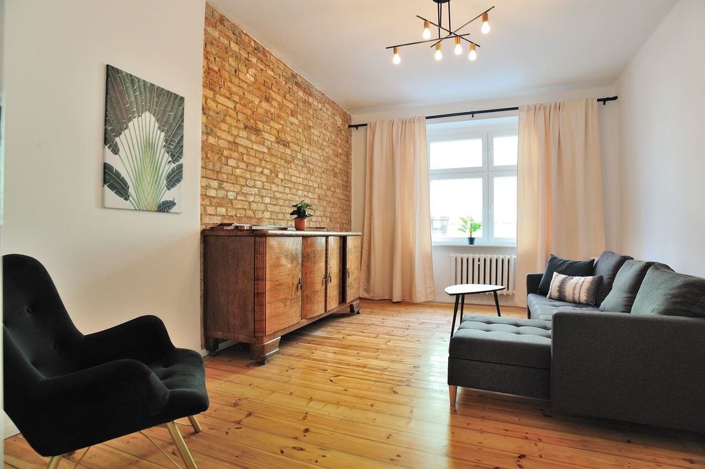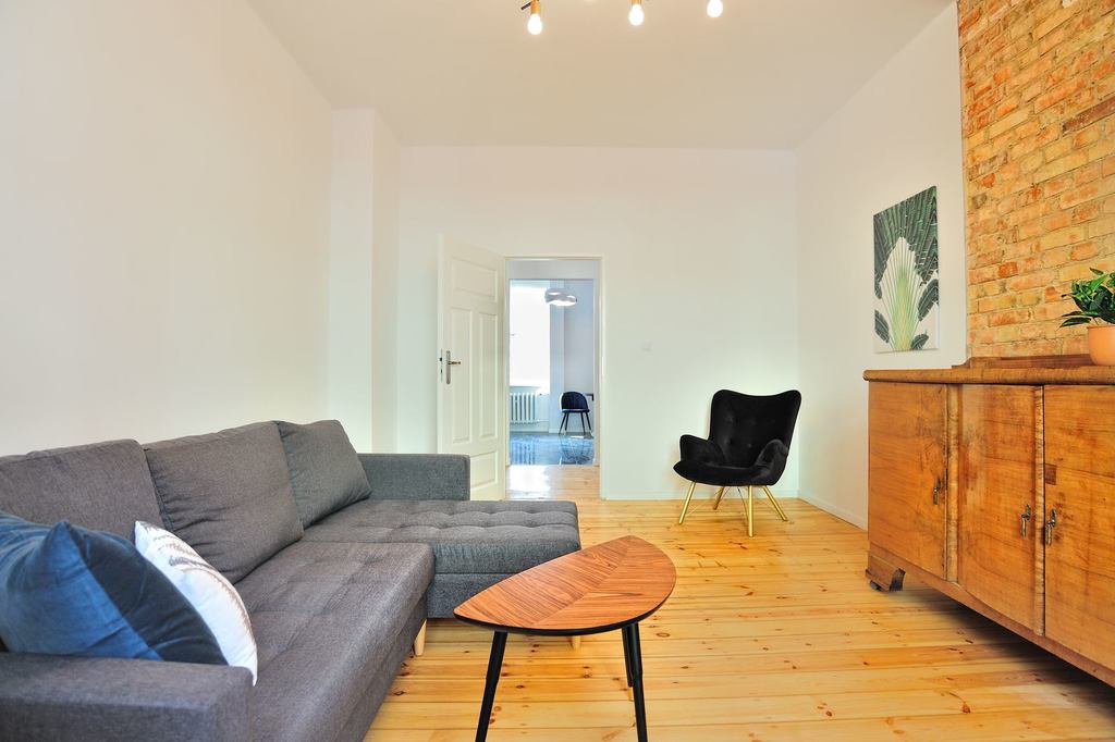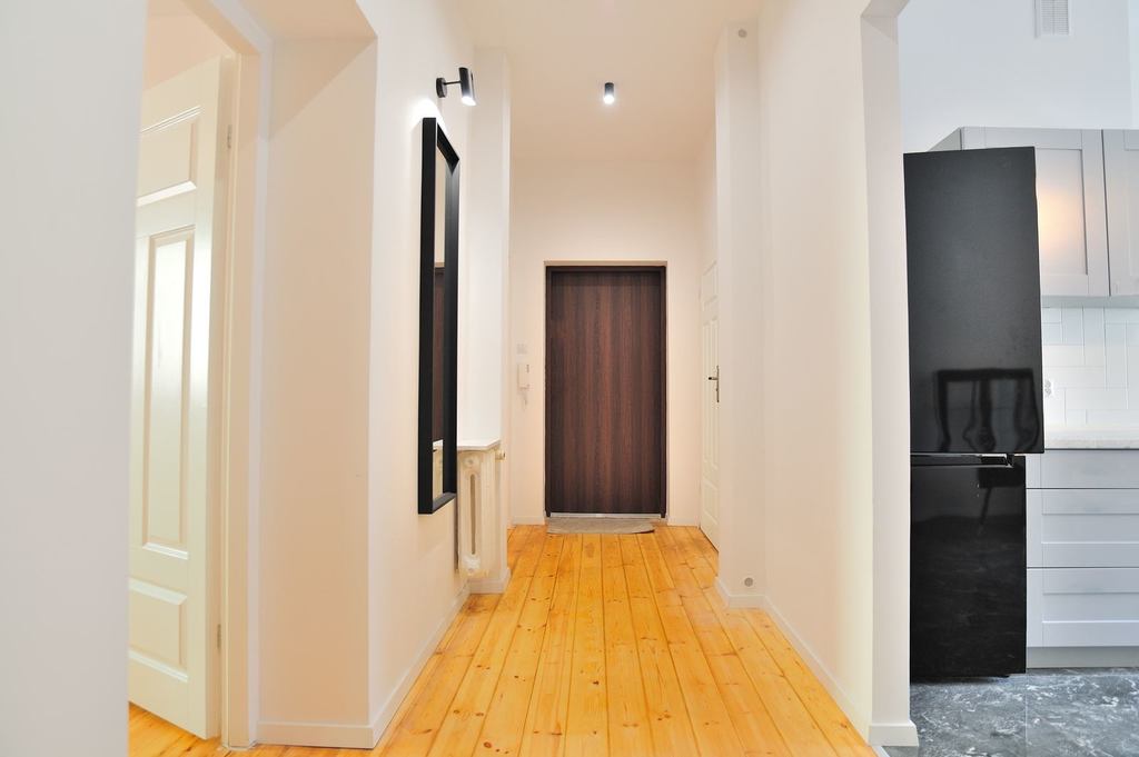 APARTMENT DESCRIPTION: An apartment for rent, located on the ground floor of a 4-story tenement house. Its total area is 62.32 m2, it is fully furnished and equipped. The apartment has two rooms, a separate kitchen, a bathroom with a toilet and a hall. Entrance to the apartment through the hall with a tall wardrobe and a wall mirror. The bathroom is equipped with a shower, washbasin, toilet and ladder radiator. It is possible to install a washing machine. The kitchen with a window is a separate room, furnished and equipped with household appliances – a fridge with a freezer, an electric stove with an oven, and an absorber. The bedroom has a bed, a floor lamp, a table and a chair. The living room is furnished with a corner sofa, an armchair, a chest of drawers and a table.