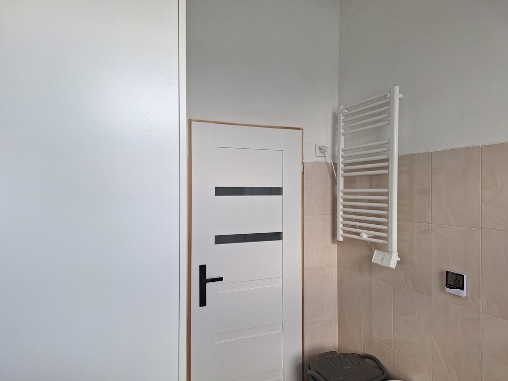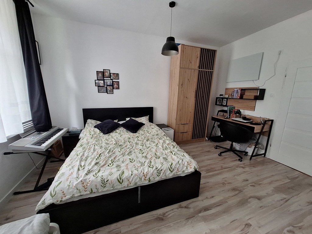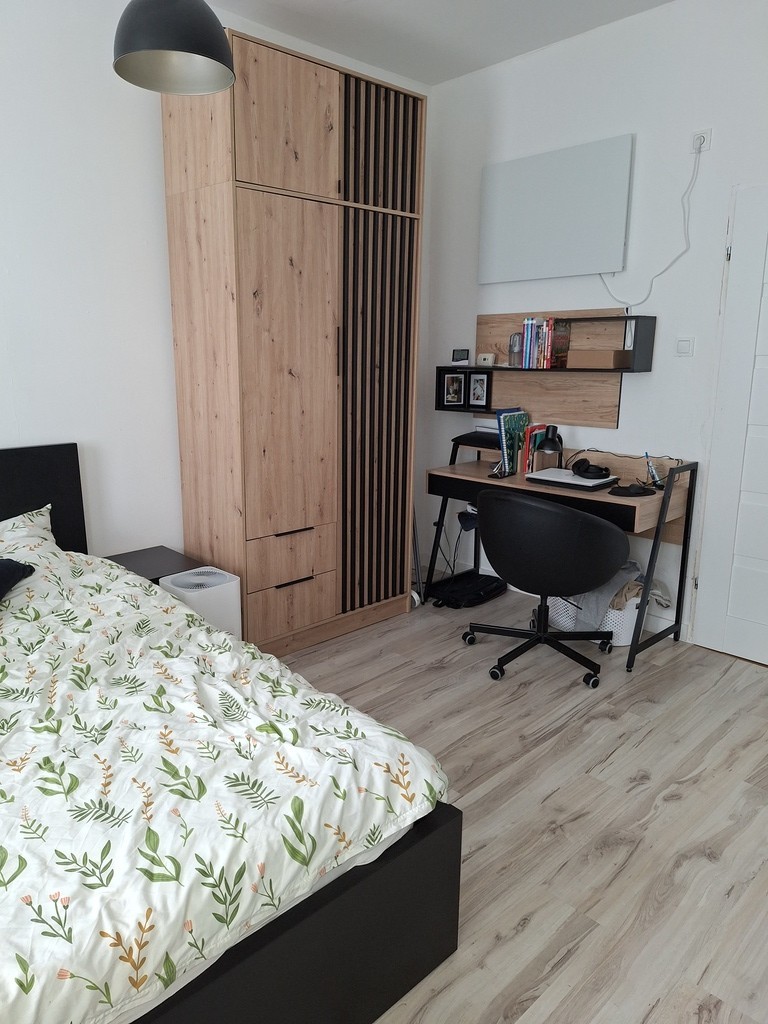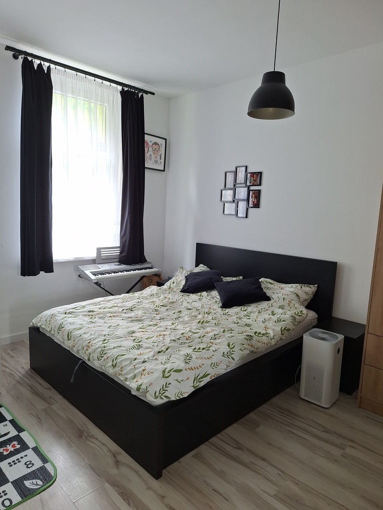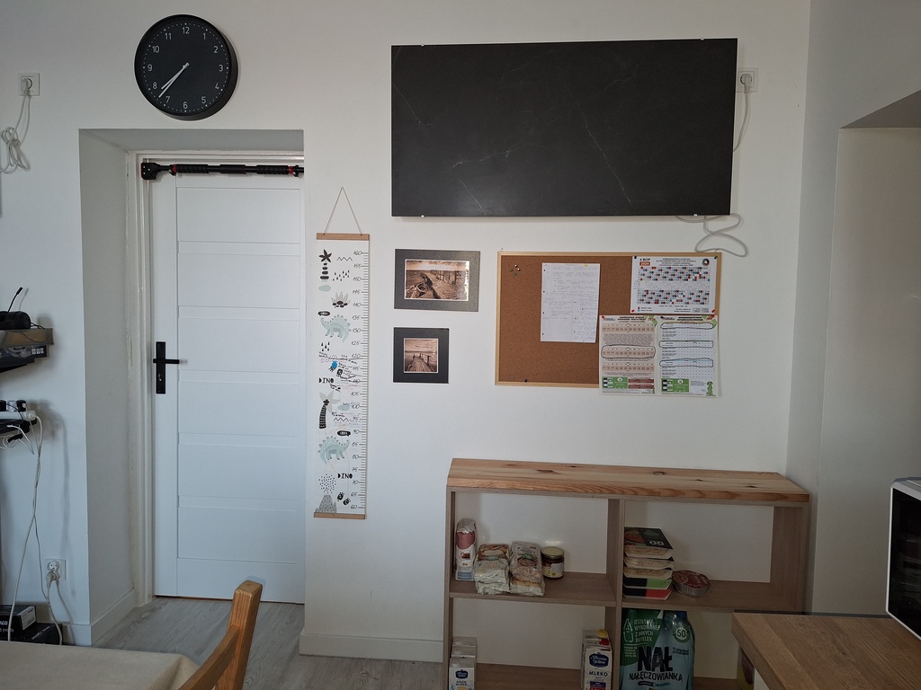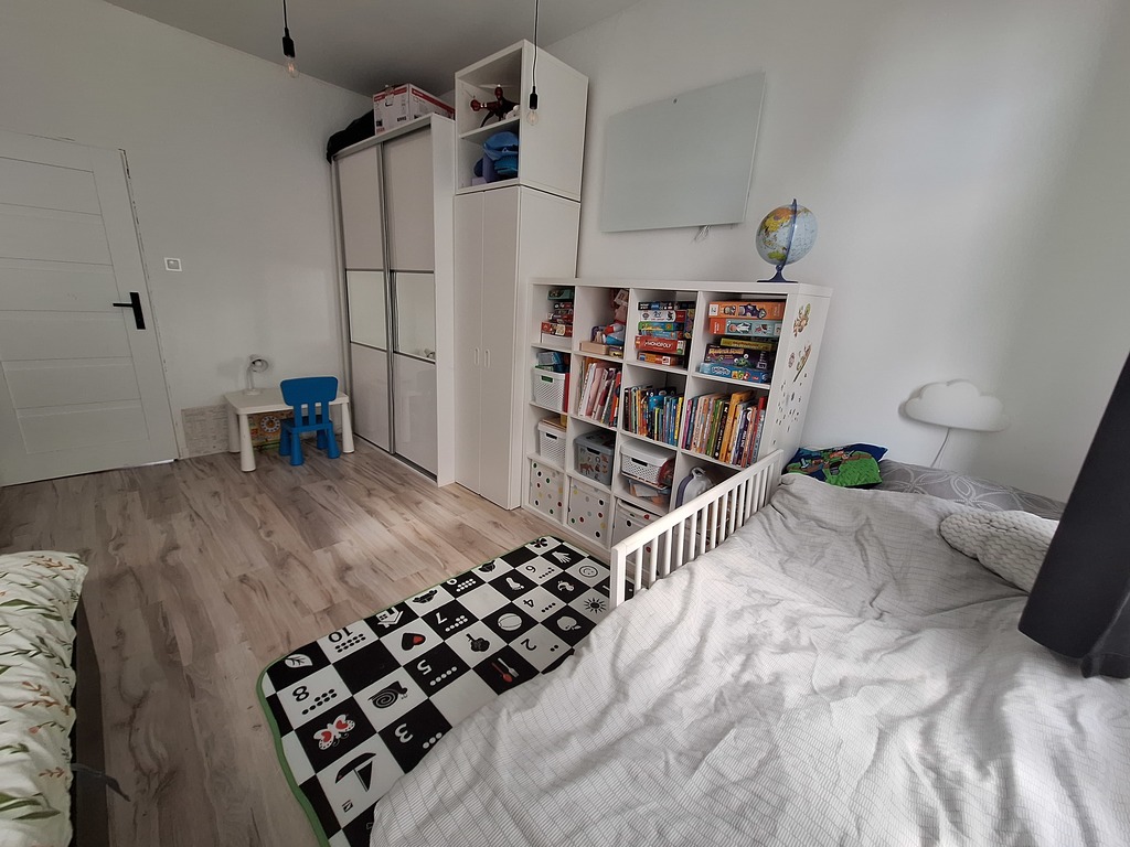 Property description: We offer for sale a spacious, two-room apartment with an area of 55.5 m², located on the 1st floor of an insulated tenement house. The apartment is sunny and spacious with two-sided east-west windows, perfect for people who value bright spaces, comfort and proximity to the forest. Apartment layout: • Living room with kitchenette (approx. 23 m²): Spacious and bright living room with two large windows on the eastern side, connected to a functional kitchenette. A kitchenette equipped with good quality furniture, an under-counter dishwasher, an induction hob and a built-in oven, a fridge with no frost function, a microwave, a coffee machine and a hood. All kitchen furniture and household appliances remain in the apartment. • Bedroom (approx. 23 m²): Large bedroom with two large windows on the west side, which allows the room to be divided into two smaller rooms. The bedroom has space for a large bed and tall wardrobes. Currently, the bedroom is divided into two zones – the children's zone and the parents' zone. • Bathroom (approx. 6.5 m²): Spacious bathroom with a large window on the eastern side, bathtub, washbasin, toilet, large utility wardrobe and a washer-dryer with a large load of up to 10 kg. The bathroom is equipped with an electric boiler for heating water and a ladder electric radiator. All bathroom furniture and household appliances remain in the apartment. • Hallway (approx. 3 m²): A cozy hall with space for a small wardrobe, shoe cabinets and a bench. All the furniture in the hall remains with the apartment. • Basement (approx. 9 m2) Heating: Electric with infrared heating panels that provide effective and economical heating of the rooms. Monthly electricity bills during the heating season are a maximum of PLN 200 higher than during the off-season, which proves the low cost of heating the apartment • Hot water: From an electric boiler.
