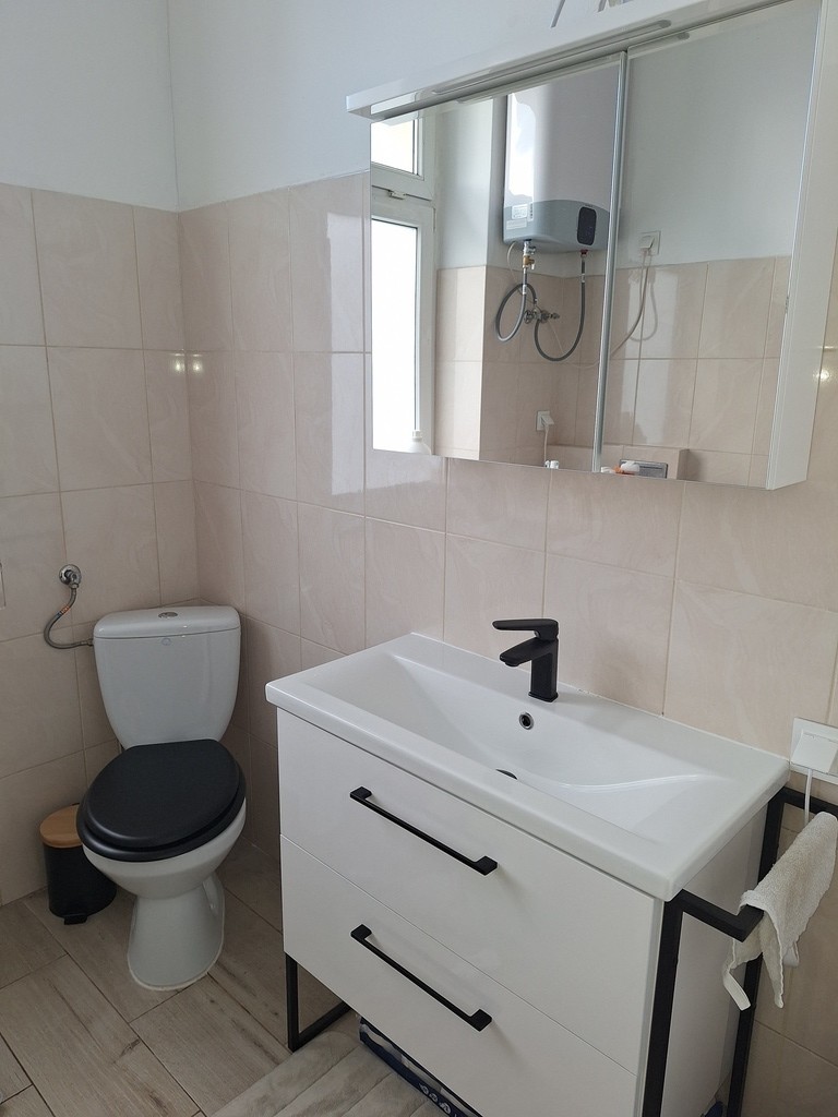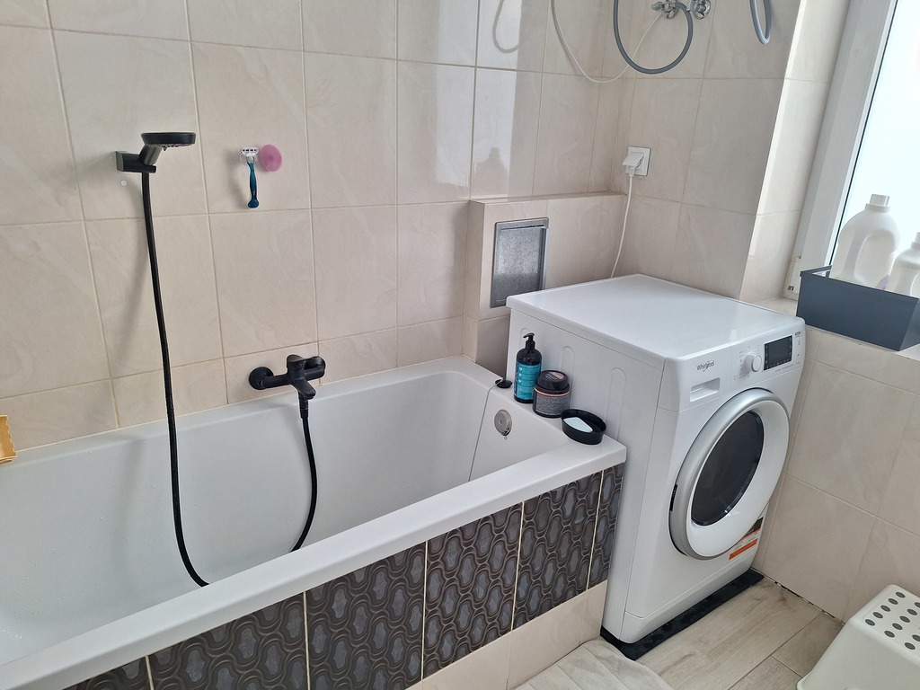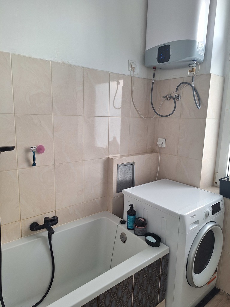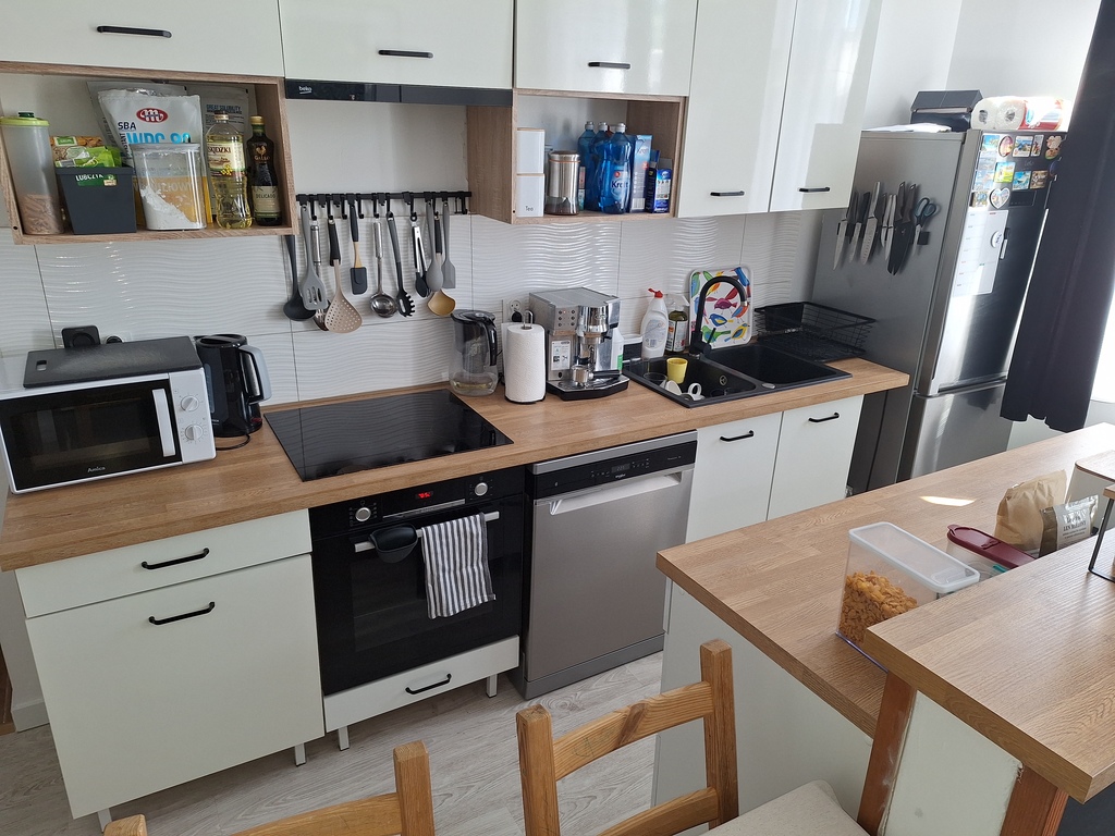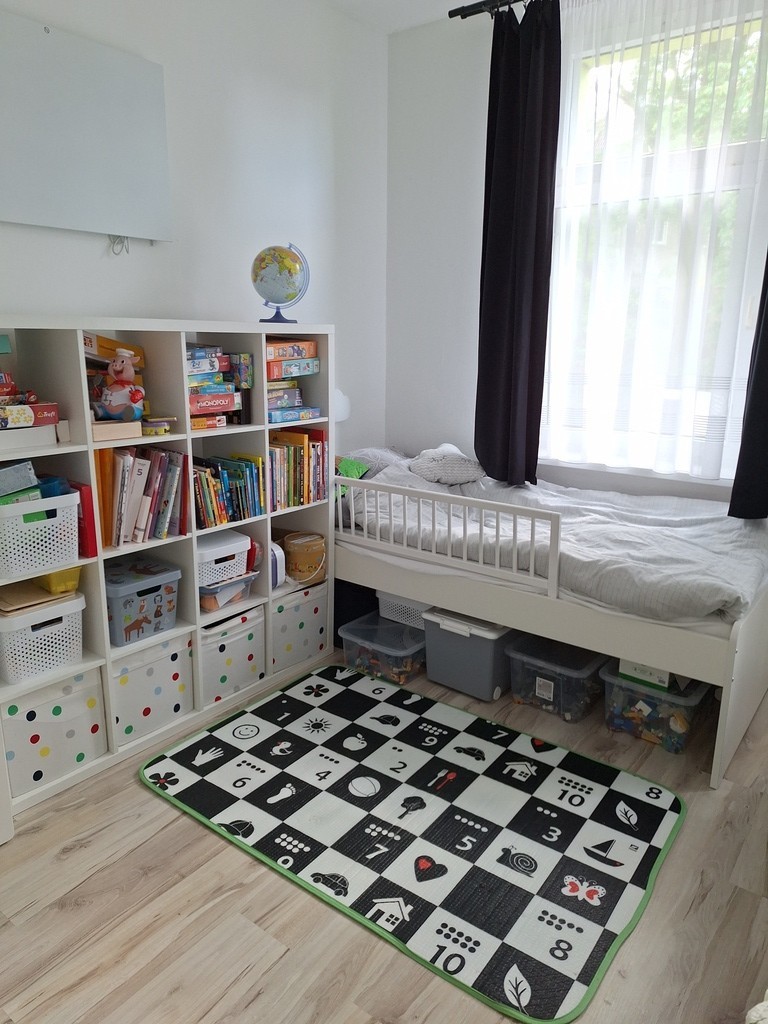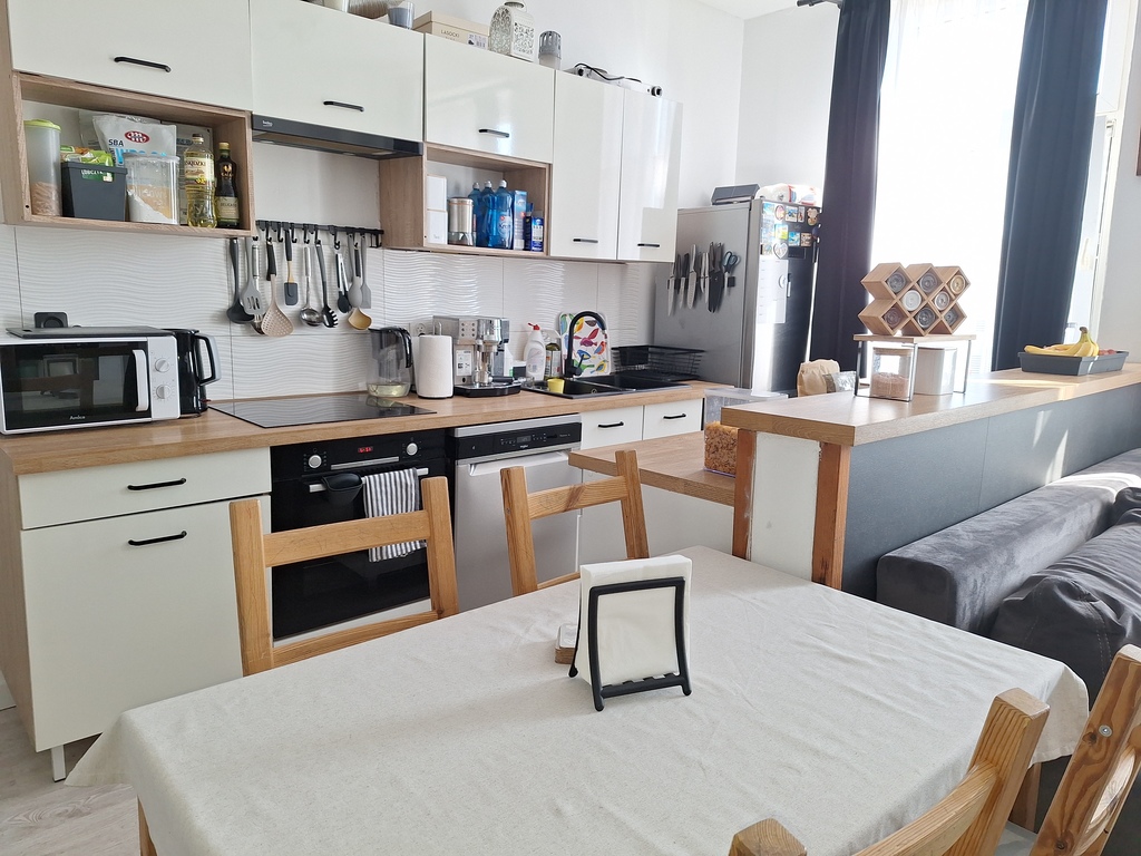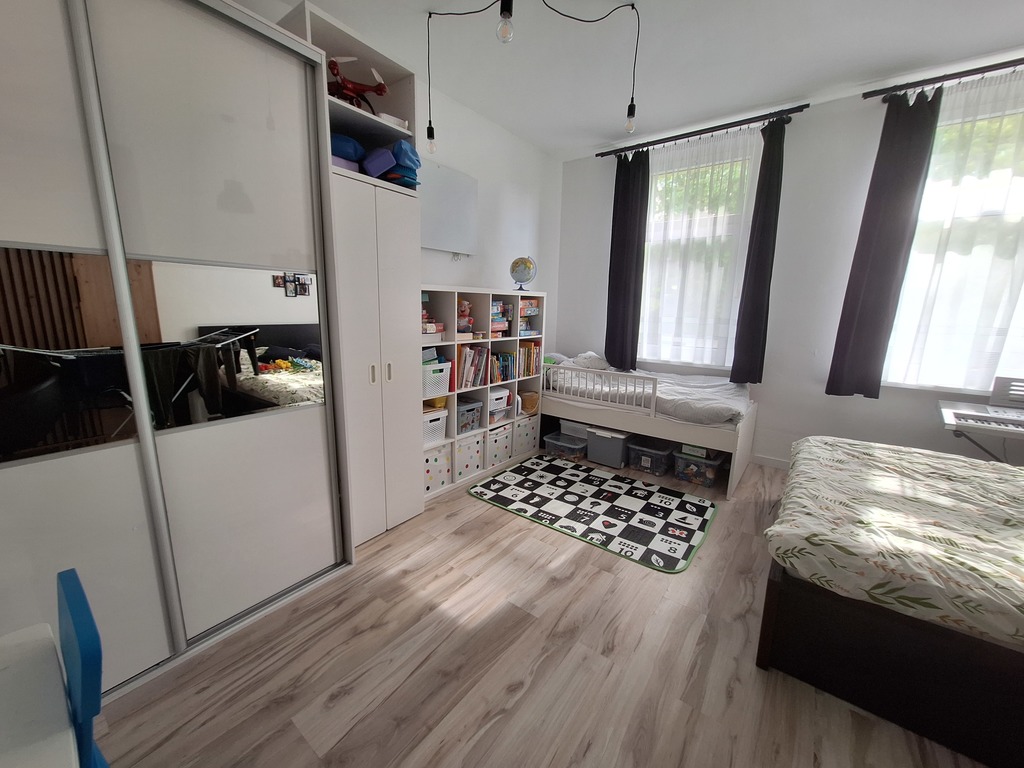 Property description: We offer for sale a spacious, two-room apartment with an area of 55.5 m², located on the 1st floor of an insulated tenement house. The apartment is sunny and spacious with two-sided east-west windows, perfect for people who value bright spaces, comfort and proximity to the forest. Apartment layout: • Living room with kitchenette (approx. 23 m²): Spacious and bright living room with two large windows on the eastern side, connected to a functional kitchenette. A kitchenette equipped with good quality furniture, an under-counter dishwasher, an induction hob and a built-in oven, a fridge with no frost function, a microwave, a coffee machine and a hood. All kitchen furniture and household appliances remain in the apartment. • Bedroom (approx. 23 m²): Large bedroom with two large windows on the west side, which allows the room to be divided into two smaller rooms. The bedroom has space for a large bed and tall wardrobes. Currently, the bedroom is divided into two zones – the children's zone and the parents' zone. • Bathroom (approx. 6.5 m²): Spacious bathroom with a large window on the eastern side, bathtub, washbasin, toilet, large utility wardrobe and a washer-dryer with a large load of up to 10 kg. The bathroom is equipped with an electric boiler for heating water and a ladder electric radiator. All bathroom furniture and household appliances remain in the apartment. • Hallway (approx. 3 m²): A cozy hall with space for a small wardrobe, shoe cabinets and a bench. All the furniture in the hall remains with the apartment. • Basement (approx. 9 m2) Heating: Electric with infrared heating panels that provide effective and economical heating of the rooms. Monthly electricity bills during the heating season are a maximum of PLN 200 higher than during the off-season, which proves the low cost of heating the apartment • Hot water: From an electric boiler.