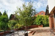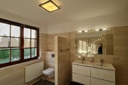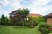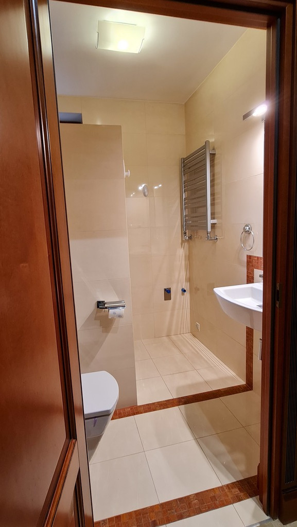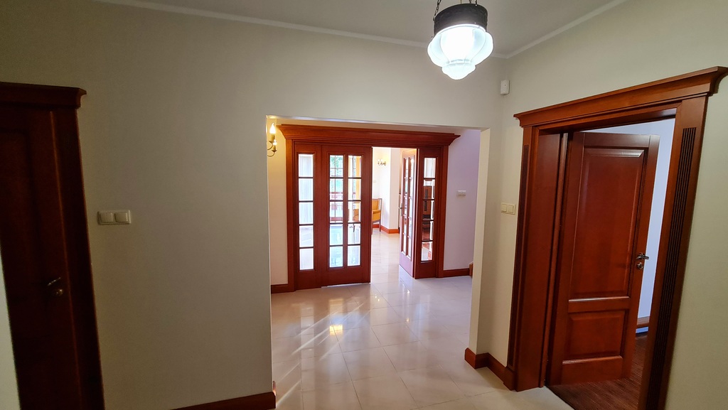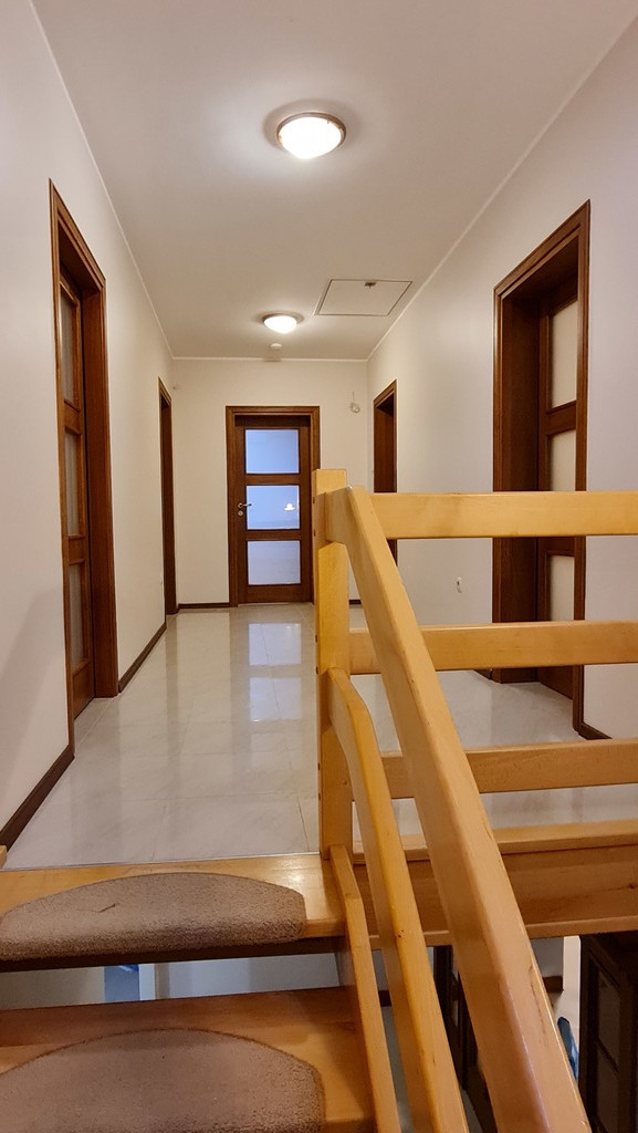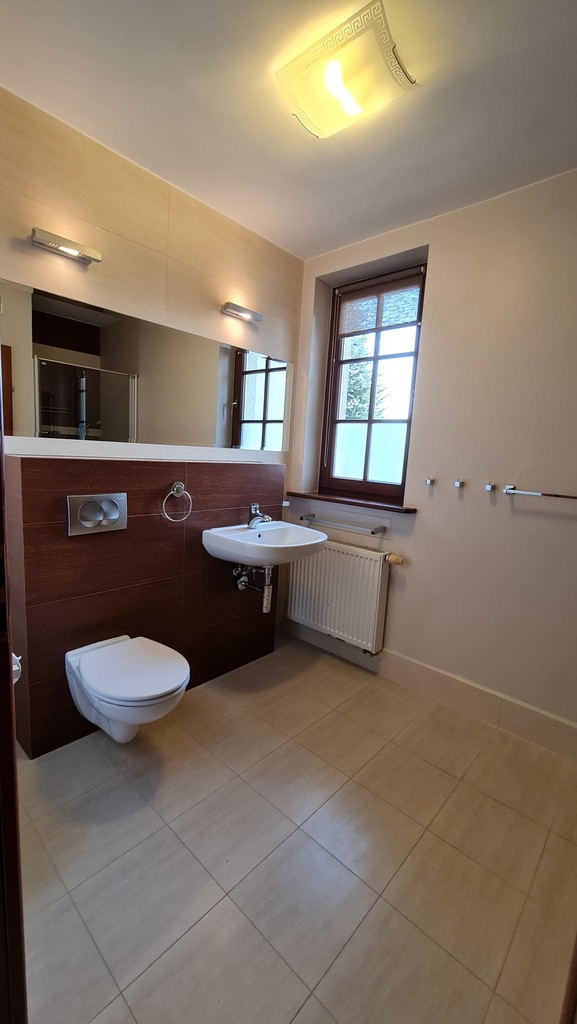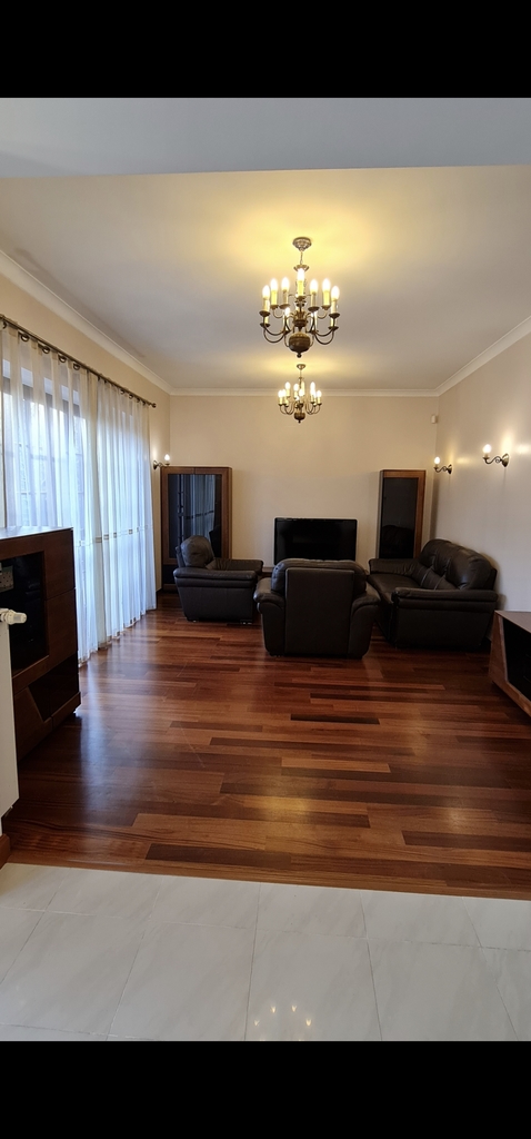 A new house located on a slight hill, among other single-family houses. Access to the house is a cul-de-sac with an asphalt surface. The ground floor of the house is made of lime-sand brick, the first floor is made of porotherm, insulated with a 15 cm layer of mineral wool, with a decorative façade layer on the ground floor made of clinker brick. Monolithic reinforced concrete ceilings, cornice – eaves made of decorative prefabricated reinforced concrete slabs. The ceiling above the first floor is insulated with a 25 cm layer of mineral wool, covered with a plank floor, and the attic is above. Roof truss covered with ceramic tiles. Mahogany windows with electric anti-burglary blinds, clock-controlled (two circuits), internal window sills made of mahogany wood, 6 cm thick. There is an alarm system in the building (including window sensors). Stairs to the treatment floor, comfortable, made of beech wood. On the north side, there is a very nice brick fence made of clinker bricks with decorative wrought iron grates, and an electric and remote-controlled entrance gate. The layout of the house is very functional. On the ground floor: on the south side, a living room of 26.12 m2 (with the possibility of connecting a fireplace) connected through a large opening to the dining room of 15 m2, then to the kitchen of 10.51 m2. From the living room and dining room you can access the terrace. On the ground floor, there are 3 separate rooms with a toilet (with a total area of 53.7 m2) with a separate entrance from the outside, and the possibility of access to the rest of the ground floor. Possibility of separating a separate premises with a separate entrance. This part has a separate electrical installation with a meter. Other rooms on the ground floor: hall, dressing room 15.13 m2, bathroom with shower 4.19 m2, boiler room with laundry room 6.64 m2, double garage 37.2 m2. On the first floor: corridor, two rooms with areas: 18.67 m2 and 18.25 m2 (the one with a wardrobe 5.27 m2), guest room 14.12 m2, bedroom 14.92 m2 with a separate bathroom 5.73 m2 and wardrobe 3.37 m2, shared bathroom 12.55 m2. On the ground floor, polished stoneware on an area of approx. 90 m2, tiles in the bathroom, toilet and kitchen (a strip above the countertop), painted rooms: kitchen with dining room, dressing room, hall, two rooms in a separate part. Modern, very economical heating – condensing gas furnace with hot water tank, automatically cleaning water filter. Areas: first floor 103.8 m2, ground floor 157.5 m2, garage 37.2 m2. The total area of the house is 298.5 m2 and it is possible to easily divide the house into two or three apartments. I recommend and invite you to such a unique house!!!