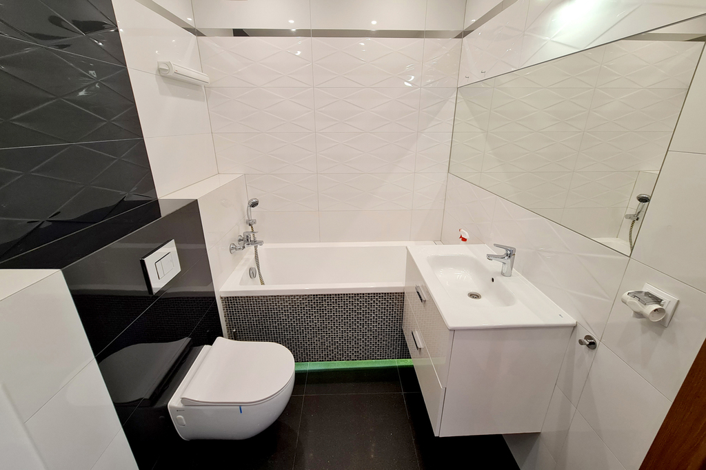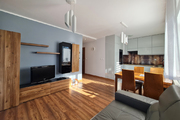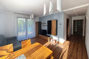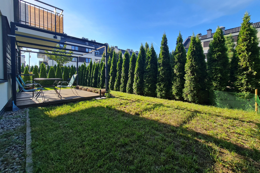 Opportunity ! Warzymice, 3-room apartment for rent, 60 m2 with a large corner garden, a parking space in the underground garage and a storage room. Property description The apartment is located on the ground floor of a low-rise block from 2018. The area of 60 m2 consists of – Bright, spacious living room with kitchenette, 20 m2 with direct access to the garden – 2 bedrooms, 10 m2 each – Bathrooms with toilet – Wardrobes with an area of 4 m2 – Garden with an area of 55 m2 – Storage room . Fully furnished apartment. Kitchen – household appliances, fridge-freezer, dishwasher, oven, induction hob. A garden with a terrace, a gazebo and numerous plants. The property also has automatically controlled anti-burglary blinds installed in the windows. Please contact me, I will answer all your questions.