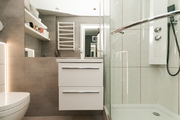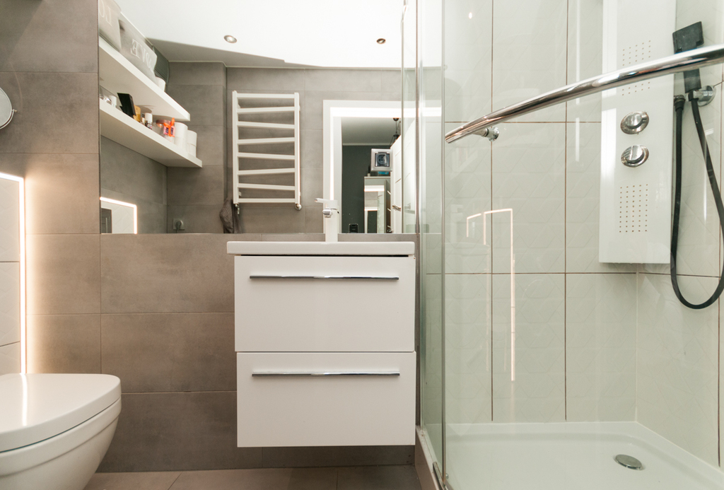 Bathroom with a shower cabin, tiles, terracotta, LED lighting.