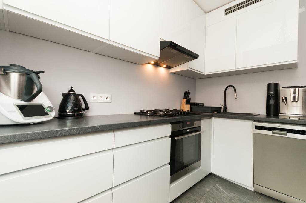 A bright kitchen with a window, built-in kitchen furniture with a dishwasher, gas hob and oven remain in the apartment.