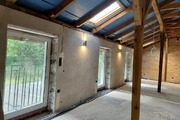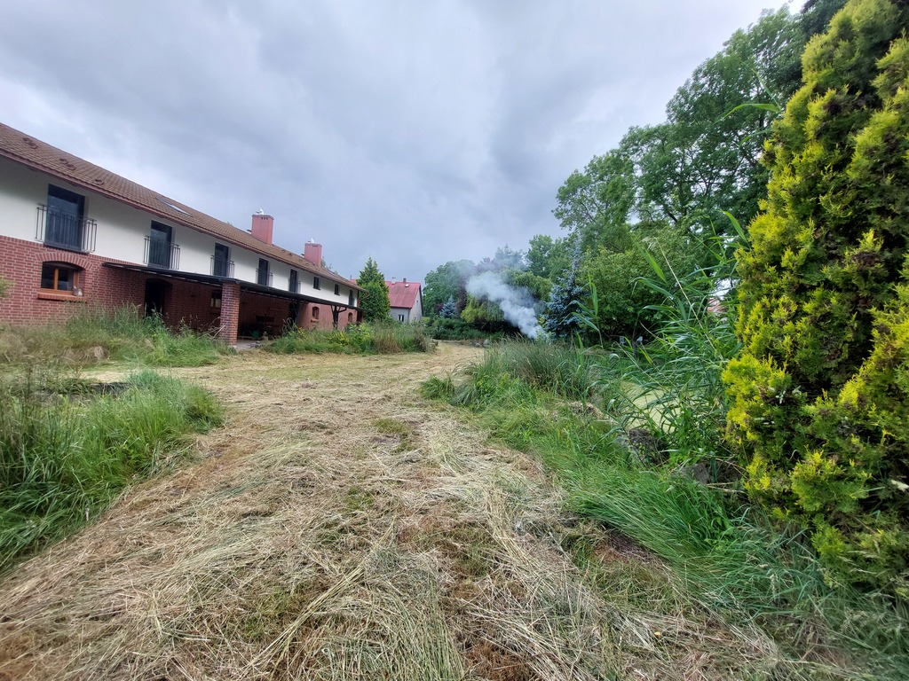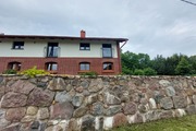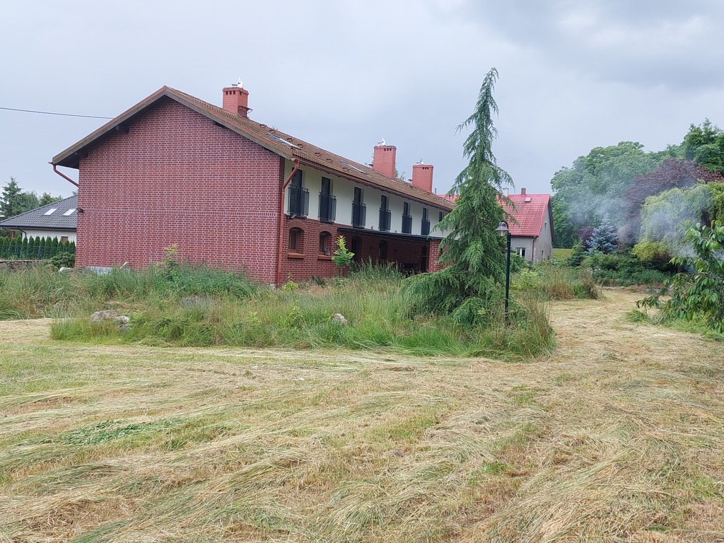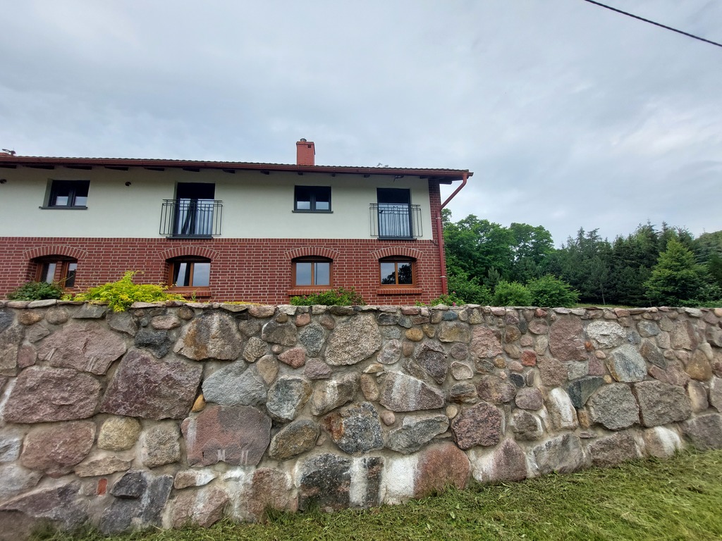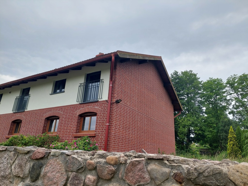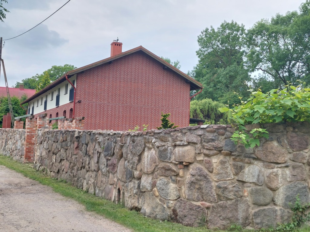 This interesting property is located 10 minutes from Szczecin in the town of Mończy, right next to the border with Germany. If you don't want to live in a typical house, which there are many in the area, you will like this house. A large plot, diversified, two ponds, with brick entrances to them. The entire area is fenced, partly with a mesh and partly with field stones. Two entrances, beautiful plants, both ornamental and fruit-bearing. The owners took care of the elements of "small architecture": there are corners where you can just sit and relax, looking at the surroundings. And the town is on the border of the Lower Oder Valley Landscape Park. The house was built from the reconstruction of a farm building. Its area is 453 m2, two garages, all made of good materials. The ground floor is: – room 23 m2 – bathroom – garages – utility room – hall – another 2 bathrooms – storage room – recreation room Forged stairs lead to the first floor where there are rooms with bathrooms, a kitchen and a living room. Each bedroom has its own bathroom and dressing room. Places for fireplaces have been prepared. A large covered terrace on the ground floor allows you to additionally enjoy the outdoors. Very close to the Oder. The Moczny community is very active. A marina is being built there, the waterfront and piers are being strengthened. The area is ideal for people who love water sports. There is a bus stop. The building itself is made of aerated concrete, finished with clinker on the ground floor, and has double and triple glazed windows. The building is undergoing finishing works, for individual interior design, without installation (heating and hot water). Due to the area of the plot and the technical facilities, there are many possibilities of installation solutions for heating and hot water preparation. Ultimately, the building is intended as a residential building with the option of agritourism, but other investment activities are also possible. You can build a hall or other farm building on the plot and thus use it, e.g. for business purposes, without damaging the entire property.