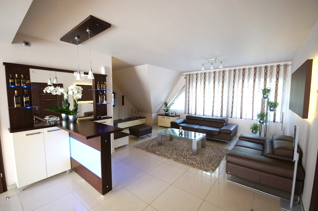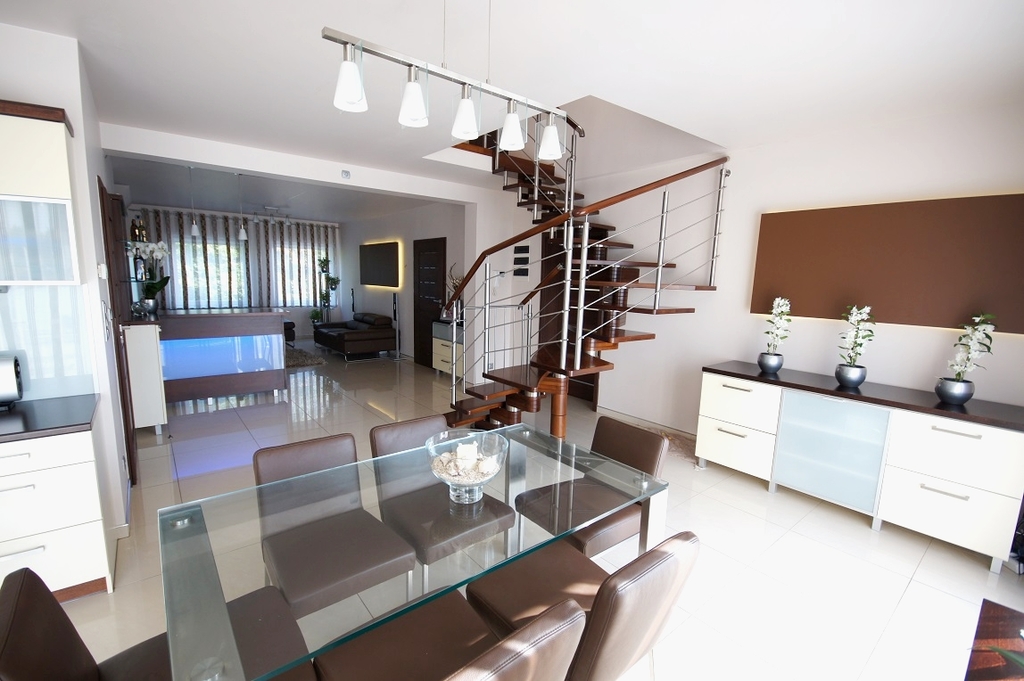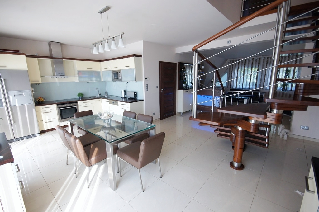 We offer for rent a two-level, fully furnished and equipped apartment with an area of 140 m2 – to a very high standard of finishing. The apartment is located on the second floor of a tenement house at ul. Bankowa in Police. On the first level (approx. 100 m2) there are: – a living room with a dining room – equipped with a bar, two LCD TVs 52 inches and 32 inches, exclusive leather furniture from Kler, a glass table and a coffee table, – a kitchen fully equipped with high-class equipment from the company Siemens and custom-made furniture, glass sliding doors with remote-controlled blinds with access to a spacious terrace with an area of approx. 40 m2 – located on the south side, very sunny and equipped with a deckchair and a table with chairs and armchairs for 8 people, – a spacious bathroom with modern lighting, two washbasins, toilet, bidet and large massage bathtub, – bedroom with a spacious Commander wardrobe, large leather bed, 32-inch LCD TV, – corridor On the second level (approx. 40 m2) there are: – office, – children's or guest room – bathroom with washbasin, toilet, bidet, shower cabin with massages and laundry room. The apartment is equipped with an alarm and fire protection system, internet, telephone, satellite TV, washing machine, dishes and a vacuum cleaner. In addition to comfort, a huge advantage of renting this apartment is the NO additional fees such as rent to the cooperative or community. Gas heating – underfloor heating on the first floor, radiators in the bedroom and on the second floor. The property includes three parking spaces, including one fenced one, a small garden and a separate staircase. The rent is PLN 4,500 per month + electricity, gas, water – depending on consumption, garbage. Two-month deposit. Occasional rental for min. one year with the possibility of extension. Preferred families with children, pets (one dog, one cat). The apartment is available from August 1. In the vicinity there are Żabka stores, 24-hour delicatessens, banks, post office, taxi rank, bus stop, schools, kindergarten, 9 km to Szczecin. I heartily recommend and encourage you to present it – do not delay, such an offer will not wait long for new tenants.