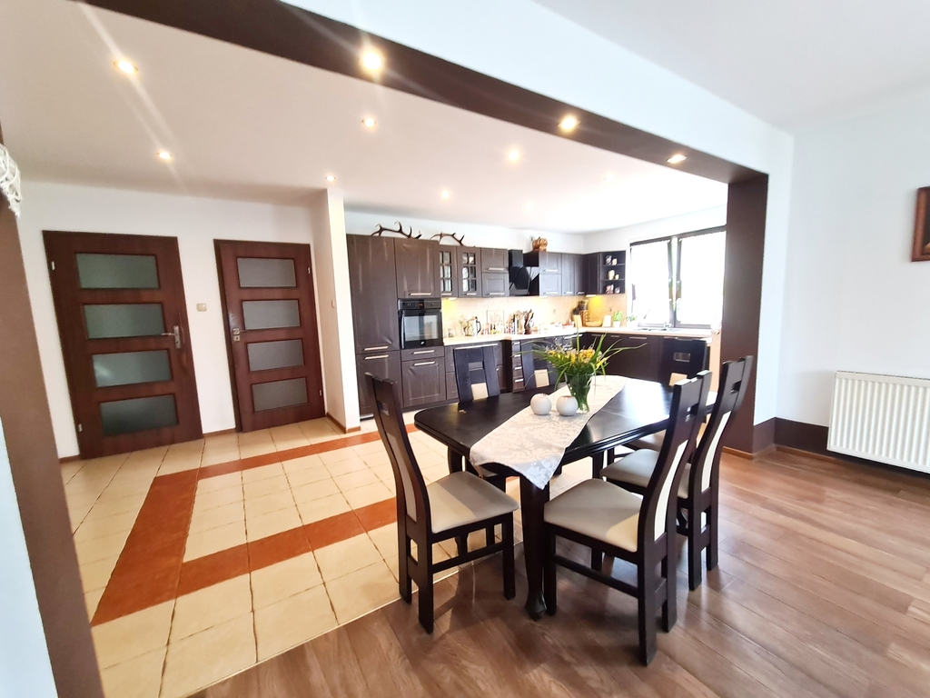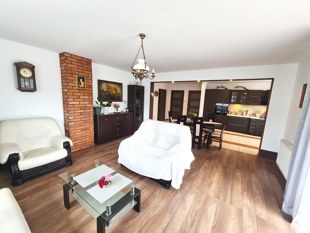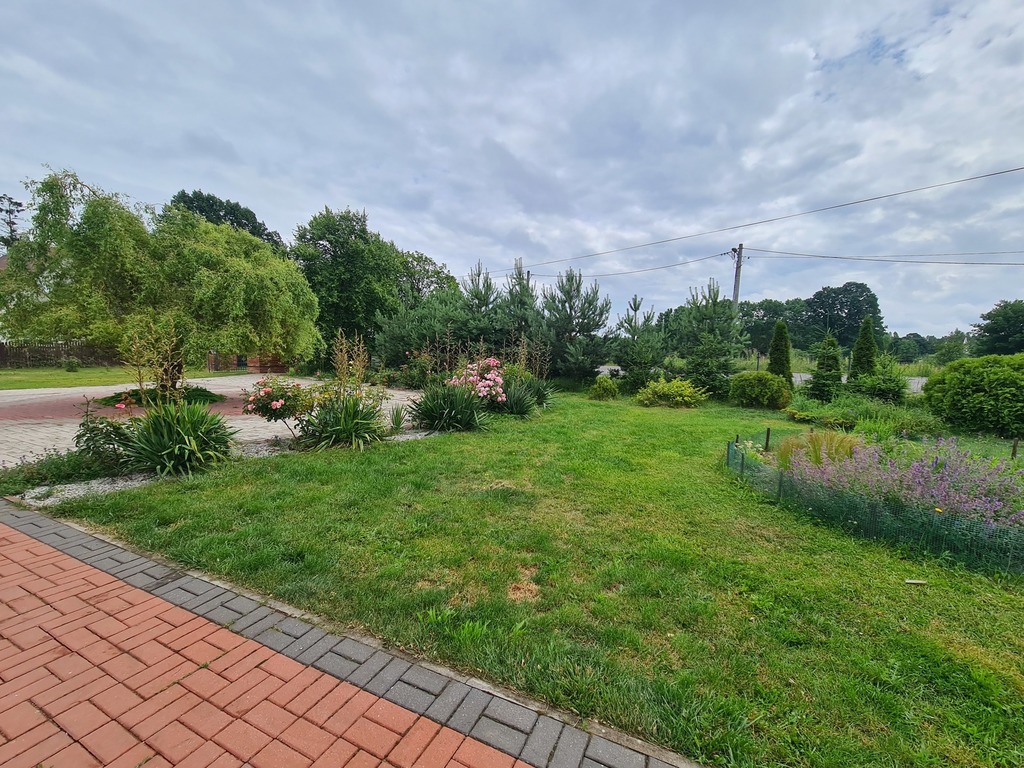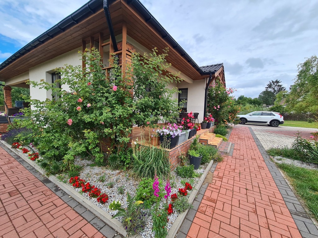 We offer for sale a very charming and spacious single-story house located in a quiet area of Witorz – between Tanów and Police. The property was built in 2018 on a plot of 7,000 m2. The usable area of 124 m2 (total 142.20 m2) includes: – kitchen with dining room and living room and access to two terraces – bathroom with bathtub, shower and toilet – bedroom – room with its own bathroom with shower and toilet – office room – toilet – hall with built-in wardrobes – hall – two utility rooms. Garage in the building for one car. A second detached garage in the yard with a shed. The price of the house includes permanent furniture and household appliances, the rest of the furniture is negotiable. The house is very well-kept and ready to move in. Solid fuel heating. it is possible to make a fireplace in the living room. The plot is beautifully landscaped with trees, flowers and rockeries. A huge fenced area with access to the river and a place for a bonfire. An ideal place for people who value peace, closeness to nature and intimacy. I cordially invite you to the presentation. Maybe this is your dream place.