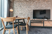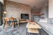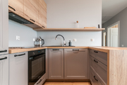 Living room with windows spanning the entire width and height of the room, kitchenette with household appliances – fridge-freezer, induction hob, dishwasher, oven, hood.