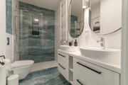 The two bedrooms are also very well-lit. One has a double bed, the other a sofa bed. The bathroom has a walk-in shower, a washing machine, and two sinks for convenience.