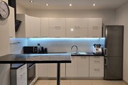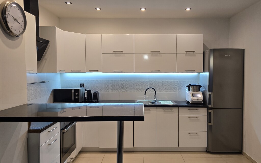 The apartment is finished with high-quality materials, built-in wardrobes in the bedroom and hallway, custom-made kitchen furniture with full household appliances from renowned companies.