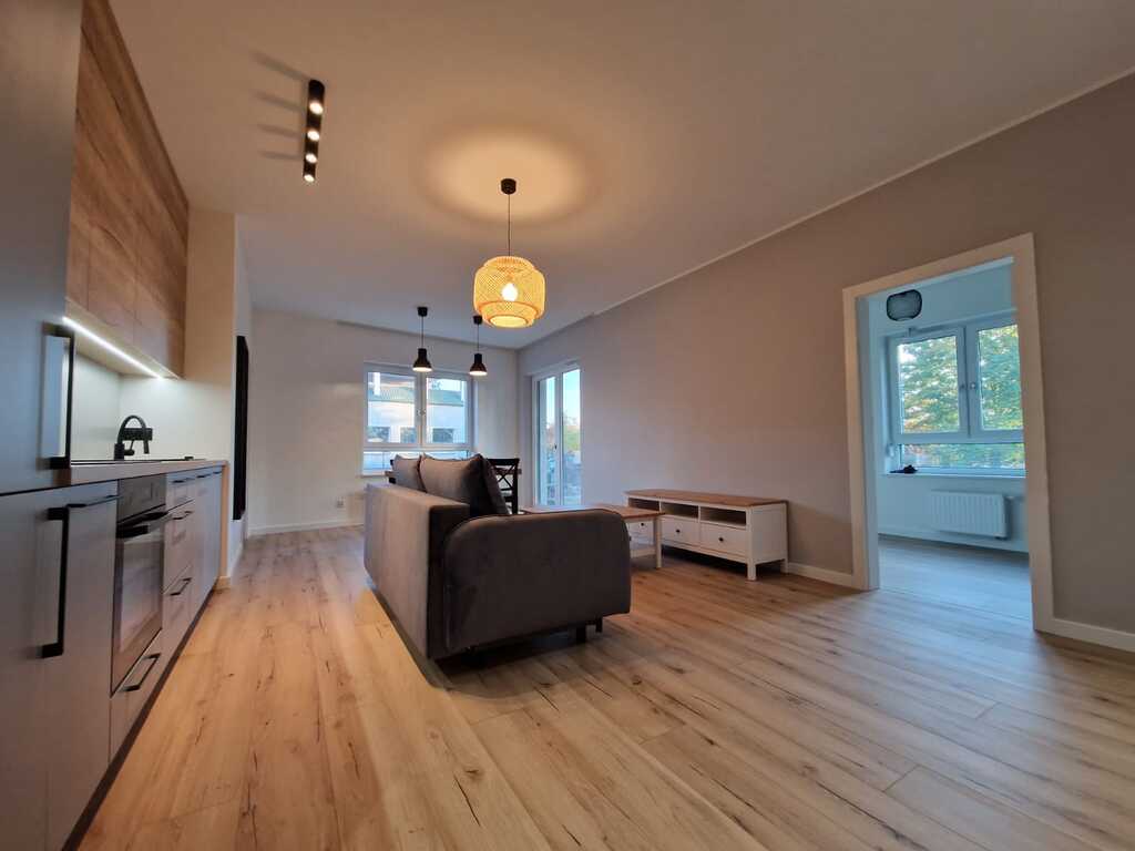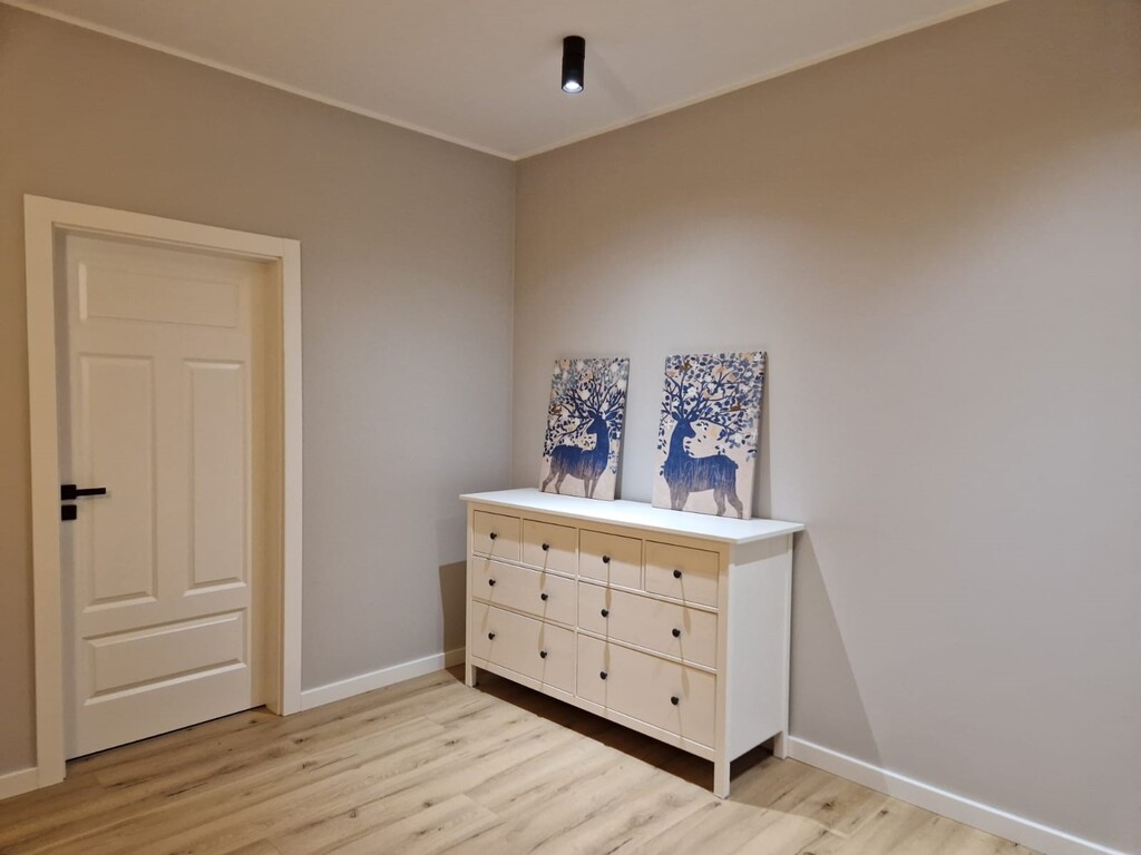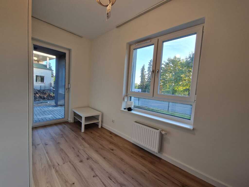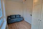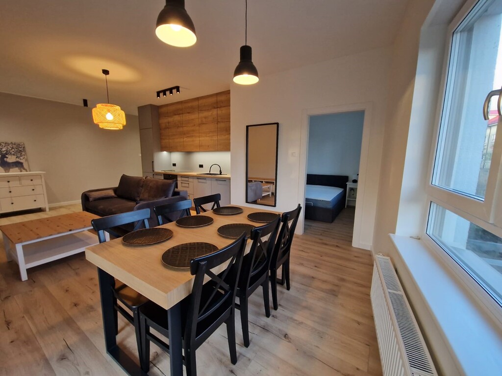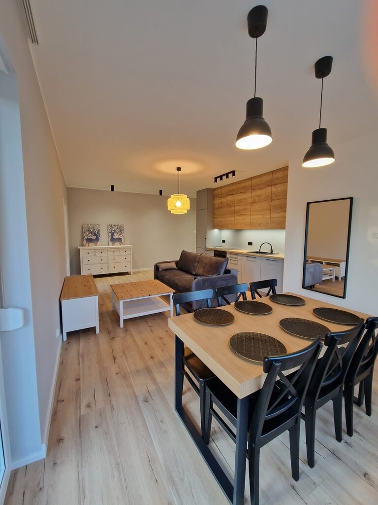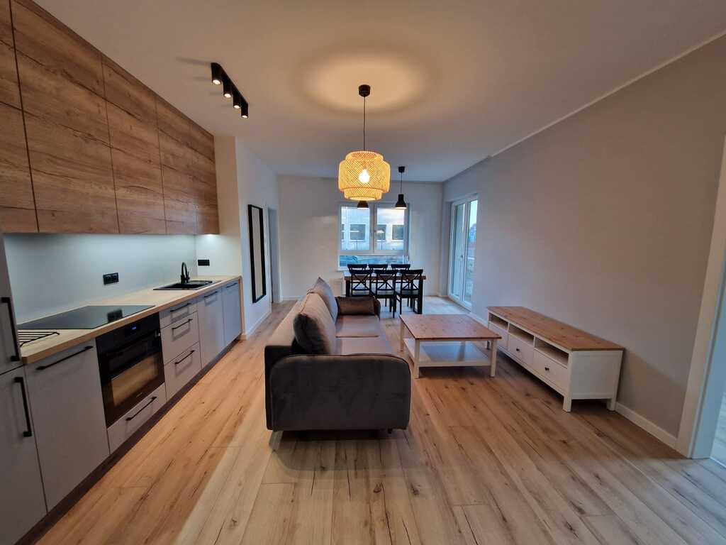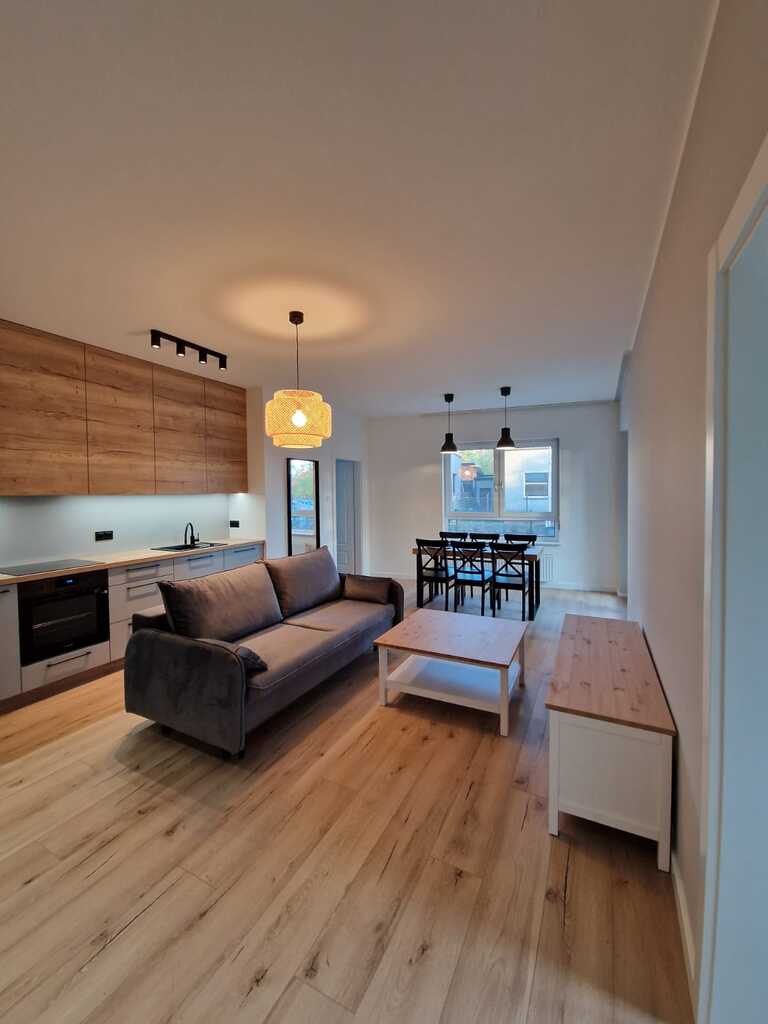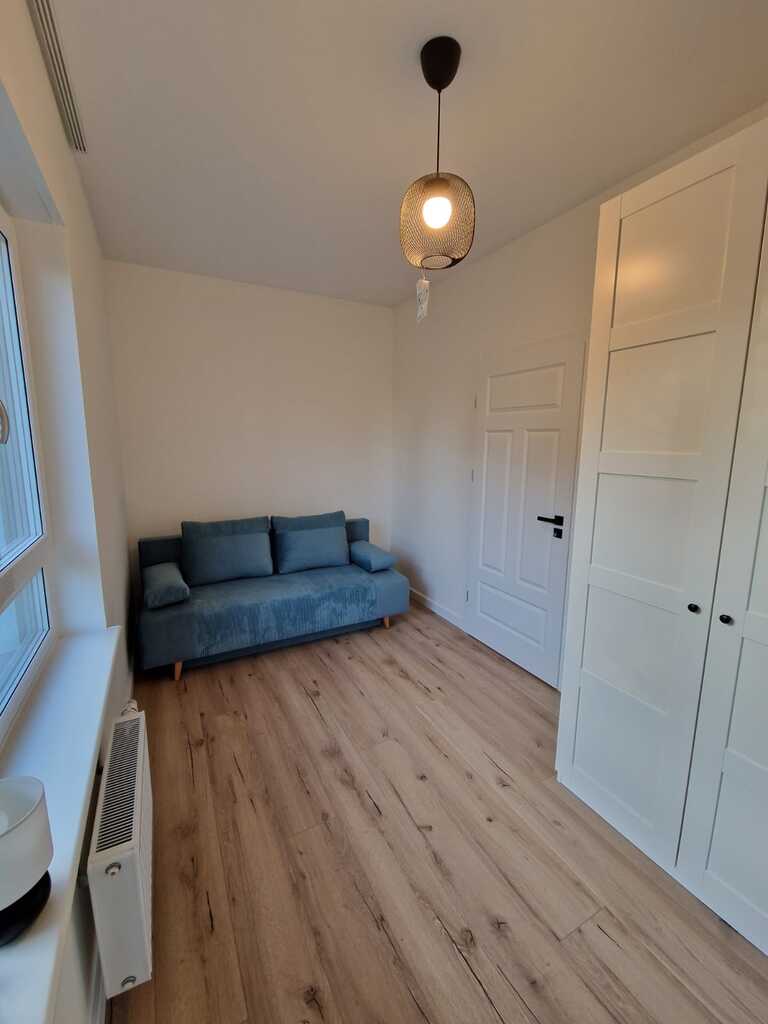 Available immediately 3-room apartment with an area of 60 m2 located on the ground floor of a new apartment building from 2022 with an elevator and a garden of over 100 m2, located in Gumieńce. Fenced, monitored area, entry to the property through a barrier. Living room combined with a kitchenette, bedroom with entrance from the corridor, bedroom with balcony – entrance from the living room and bathroom, hall, balcony. City heating and hot water. High standard of finishing the apartment. Rent PLN 5,000, rent to the manager PLN 500, electricity. total rent to the manager with fees around PLN 900. Parking space fee PLN 200. One-month deposit required, deposit for animals PLN 7,000. LIVING ROOM: Smooth walls and ceilings, painted with Flugger paints. Waterproof floor panels by Meister. MDF skirting boards, 8 cm high. Ceiling curtain rods with IKEA Majgul curtains. 3-seater sofa bed with sleeping function and bedding container LUKAS – AGATA MEBLE. Carpet. Coffee table with wooden shelf – IKEA HEMNES. Wooden TV cabinet – IKEA HEMNES. BEDROOMS: Walls and ceilings smoothed and painted with Flugger paints. Waterproof floor panels by Meister. MDF skirting boards, 8 cm high. Ceiling curtain rods with IKEA Majgul curtains. Graphite upholstered bed 140 cm IKEA BJORBEKK with a hard AKREHAMN foam mattress with a removable cover. Bedside table. Black pendant lamp and standing bedside lamp. HALLWAY: Wardrobe – IKEA PAX. Lighting. BATHROOM: Stoneware tiles on the walls and floor. Walk-in glass shower screen, thermostatic mixer tap, rain shower and separate shower head by Grohe, linear drain in the floor. Washbasin with 60 cm cabinet (2 drawers), wooden countertop, Grohe mixer tap. Mirror with wall lamp. Washing machine connection. Toilet on a built-in stoneware frame. Bathroom doors by Polskone, Fiord type, black door handles. KITCHEN: Built-in kitchen furniture with Samsung household appliances (fridge-freezer, dishwasher, oven, hob), Kernau hood permanently connected to the ventilation shaft. Single-bowl black sink. Flexible black sink mixer tap. Wooden kitchen table with chairs.
